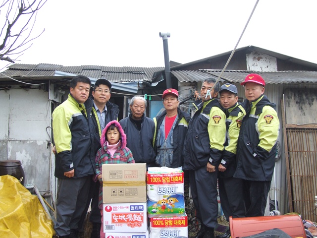 춘천의용소방서 예방반 반장 송성집외 대원일동은 연말을 맞아 어려운 독거노인에게 생필품을 전달하며 위로 하였읍니다