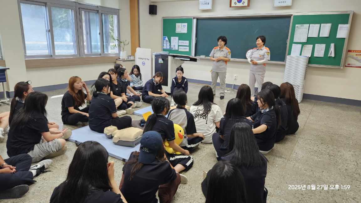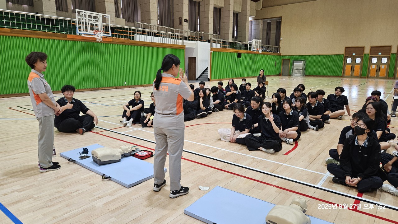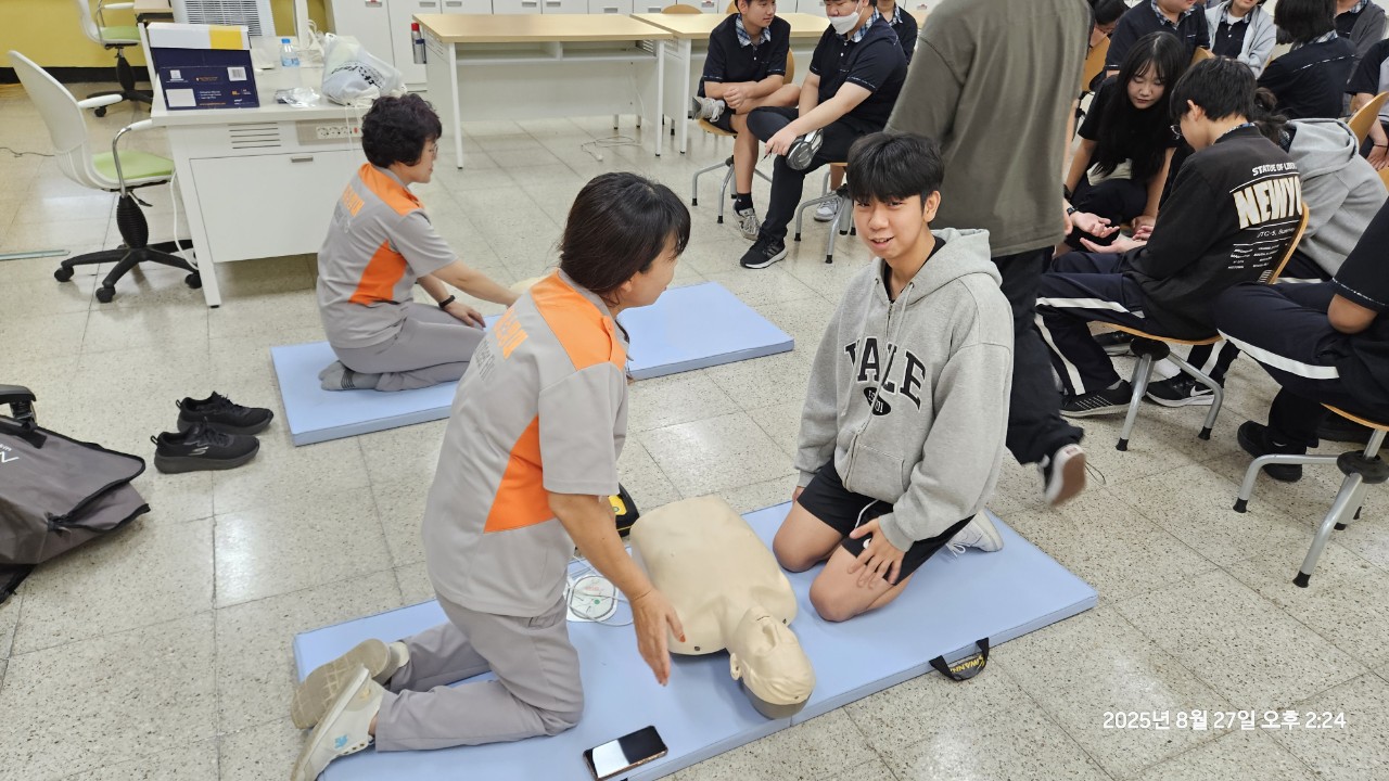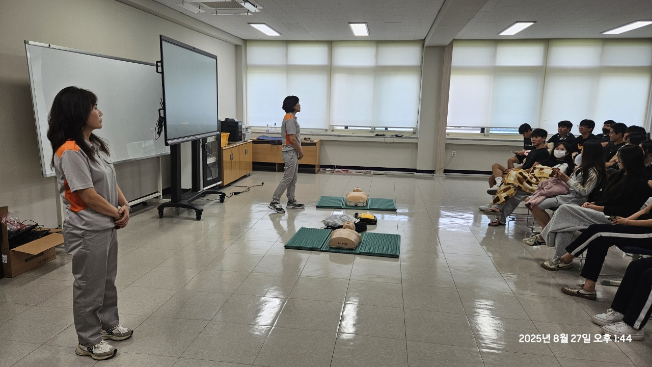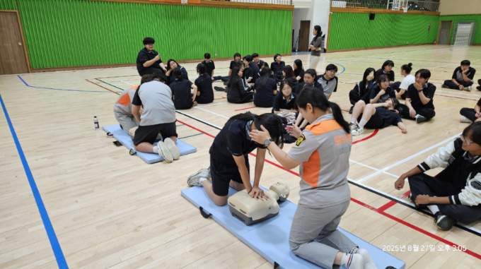 춘천남성대, 춘천응급처치전문대는 '25.8.27.(수) 13:00 ~ 16:00까지 춘천시 신북읍 한샘고등학교에서 심폐소생술 및 응급처치 교육을 실시하였습니다. 대원들의 시연과 학생들의 실습위주로 교육이 진행되었으며 학생들의 높은 호응으로 성공적으로 마무리 되었습니다.