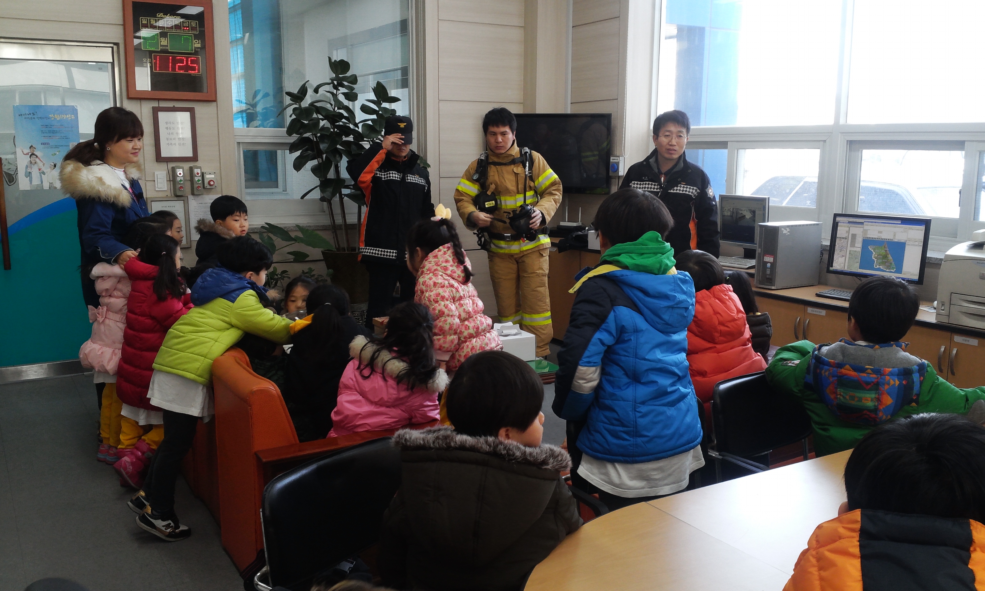 효자119안전센터(센터장 소방위 정석찬)에서는 금일 11시경 소방서 견학을 위해 찾아온 열린유치원 어린이들에게 소방장비 체험 및 소방서가 하는일등을 교육하였습니다.