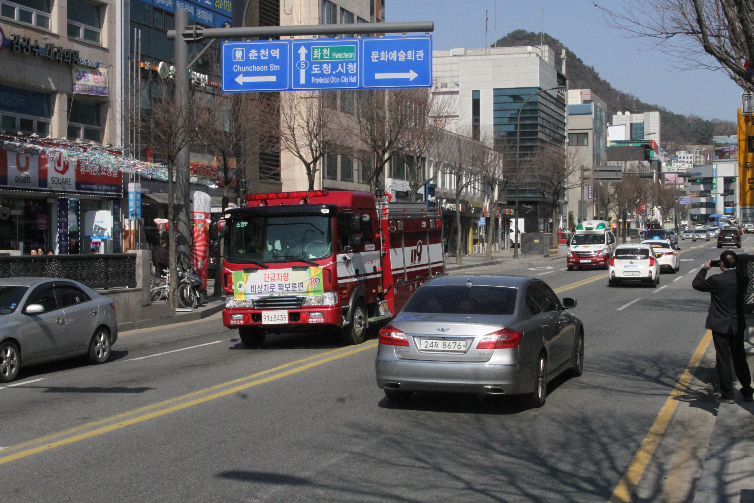 춘천소방서(서장 안중석)는 15일 오후 2시 민방위의 날 맞이 소방차 길 터주기 국민참여 훈련 및 긴급차량 출동 유관기관 합동훈련을 실시했다.