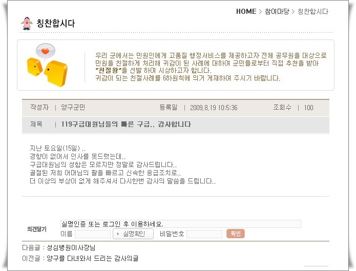 | 35 | 우리 칭찬 받았습니다.^^ | 양구119안전센터 | 2009-08-21 | 1511 | |