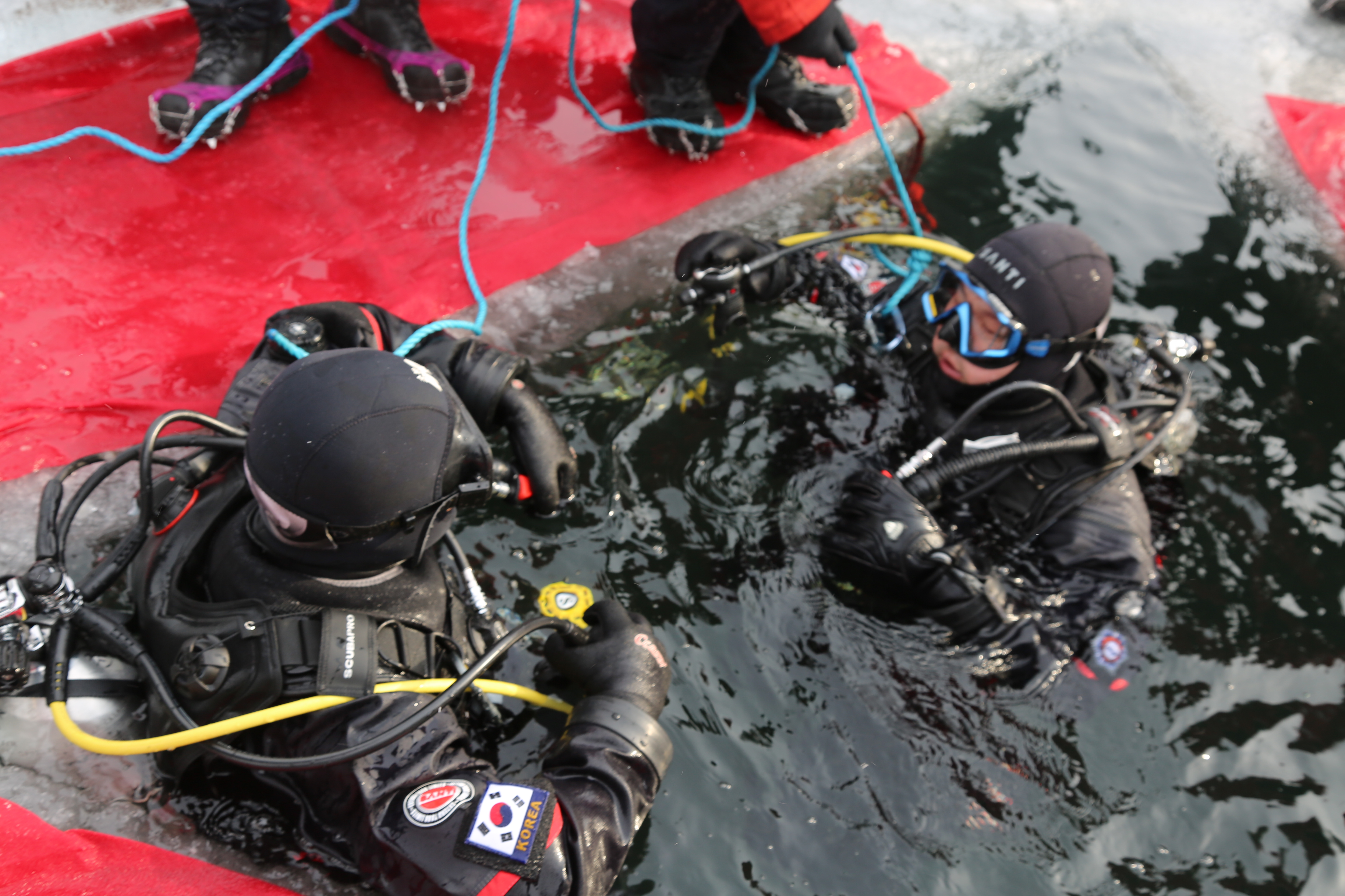 ○특히춘천119구조대는 구조기술 향상을 위해 입ㆍ출수 지점 얼음 천공과 드라이슈트 착용ㆍ입수, 수중탐색기법, 이용 구조대상자 구조법, 위험 상황 대처요령, 2인 1조 수중탐색법, 물속에서 로프를 활용한 신호ㆍ수신호 실습, 익수자의 저체온증 대처ㆍ응급처치 등 현장 중심 훈련을 진행했다.