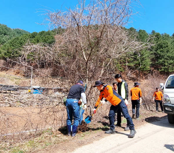 주진복 서장 외 10명의 소방공무원과 농협중앙회 직원 30여 명은 벗나무 1년생 묘옥100주를 식재하고 마을주변 환경정화활동과 농촌일손돕기 등에 동참했다.