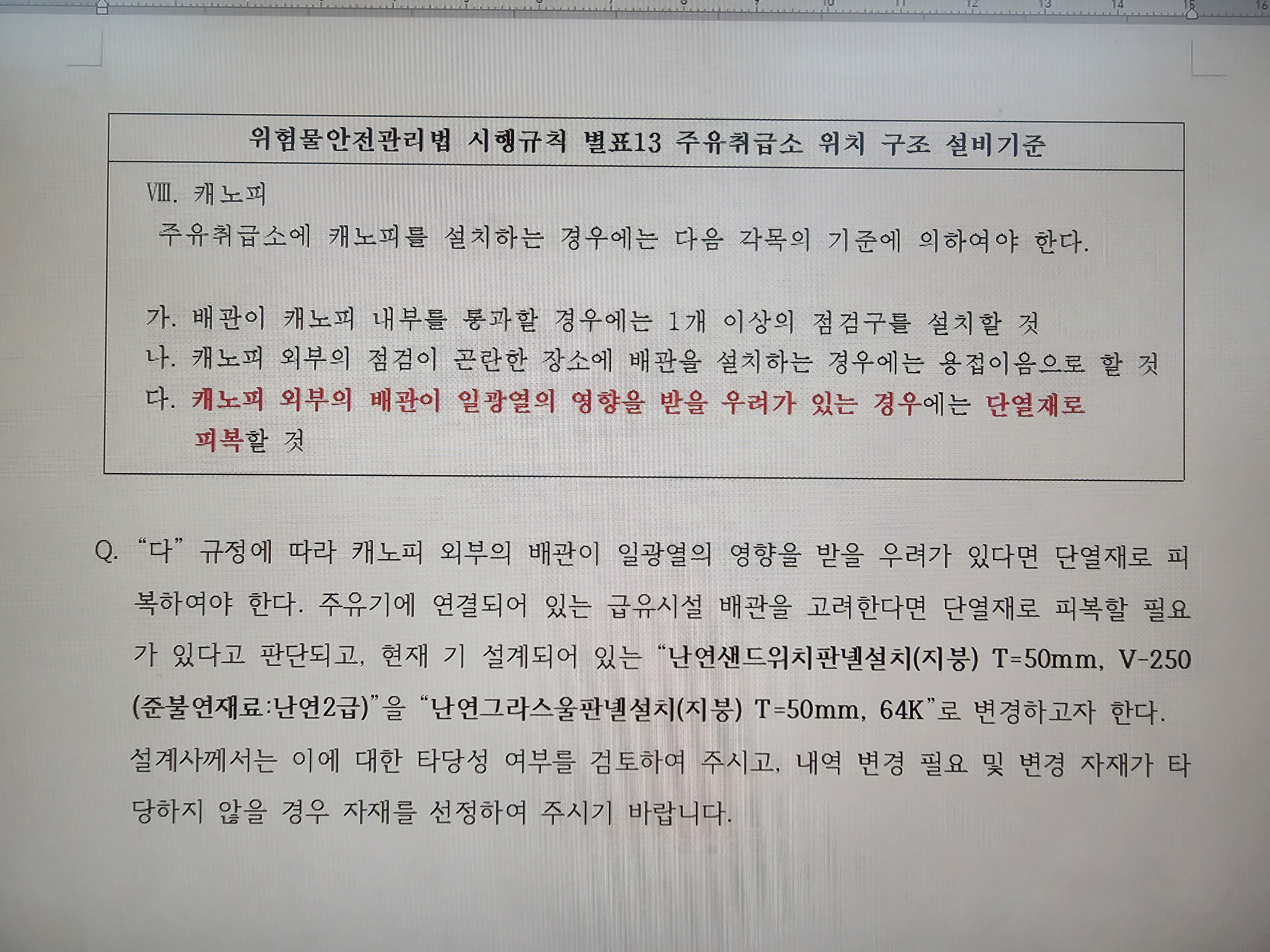 위험물관리법 시행규칙 별표 13에 따라 캐노피 규정 상 자재 문의드립니다. 저는 군 공사감독관으로 현재 자가주유취급소 고정급유설비가 설치되는 주유대 캐노피에 난연2등급 샌드위치판넬이 반영되어 있습니다. 규정상 "캐노피 외부의 배관이 일광열의 영향을 받을 우려가 있는 경우에는 단열재로 피복할 것" 이라 명시되어 있습니다. 저희 공사는 지하의 유류탱크로부터 지반을 통해 급유시설로 이어지고 외부의 배관은 급유장치로 볼 수 있을 것 같습니다.
