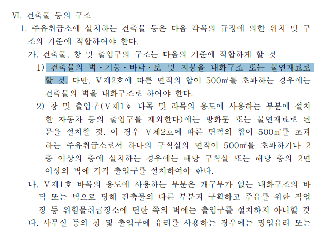 질의 3) "주유취급소에 설치하는 건축물은 지붕을 내화 구조 또는 불연재료로 해야 한다" 에 따라 현재 설계되어 있는 캐노피는 난연재인데, 불연재료 변경해야 하나요?