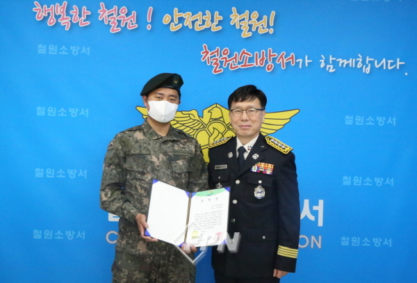 표창을 받은 유공자는 5군단 15방공단 신경민 중사다. 그는 지난달 20일 오후 8시 46분께 동송읍 오지리 산불에서 소방차량을 신속하게 유도하고 인접 산으로 연소가 확대되는 것을 방지하며 군민의 재산 보호에 기여한 공을 인정받았다.