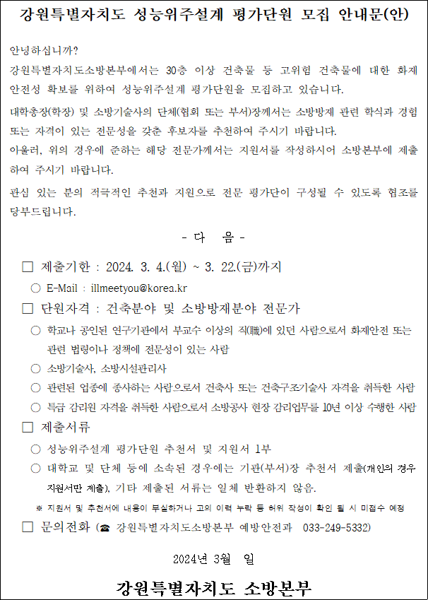 강원특별자치도 성능위주설계 평가단원 모집 안내