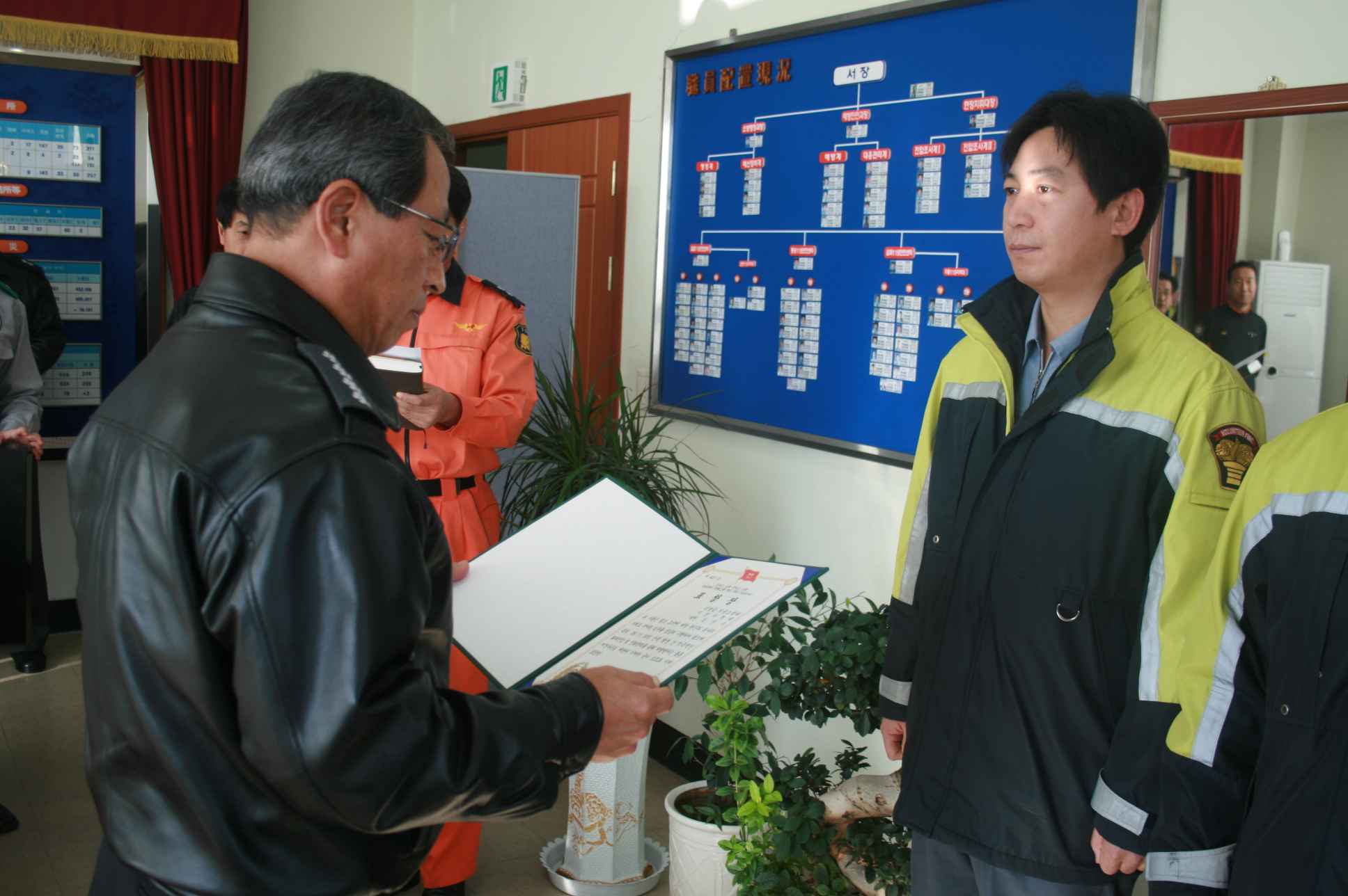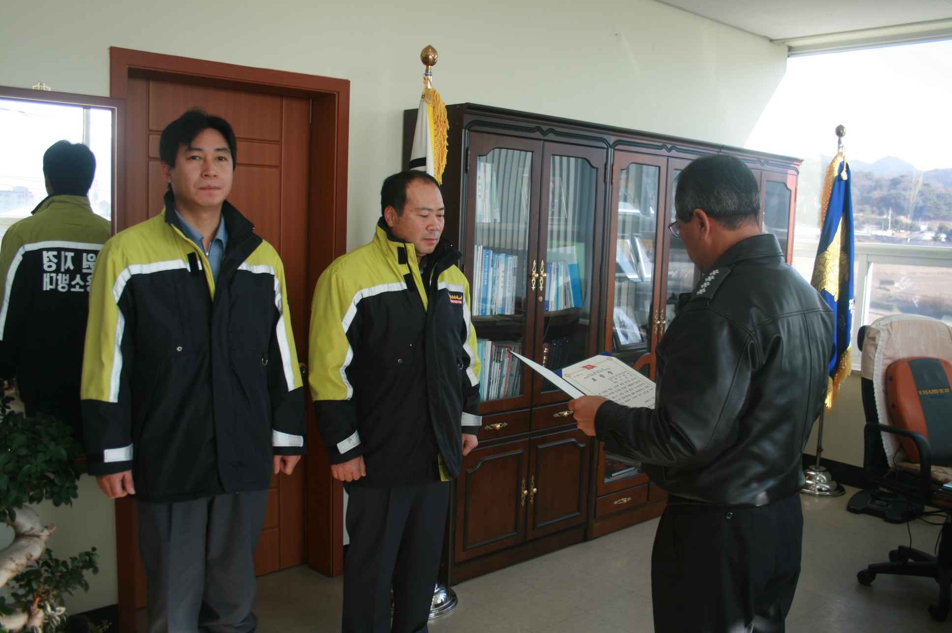 철원소방서(서장 김진봉)은 21일 오전 11시 집무실에서 지난 11월 18일에있었던 갈말읍 지경리 갈현고개 인근 산불화재 진압에 유공이 있는 김명호 대장(갈말의용소방대 문혜지역대)과 김진수 대원(갈말의용소방대 지경지역대)에게 사단장(제3보병사단장)표창장을 전수했다.