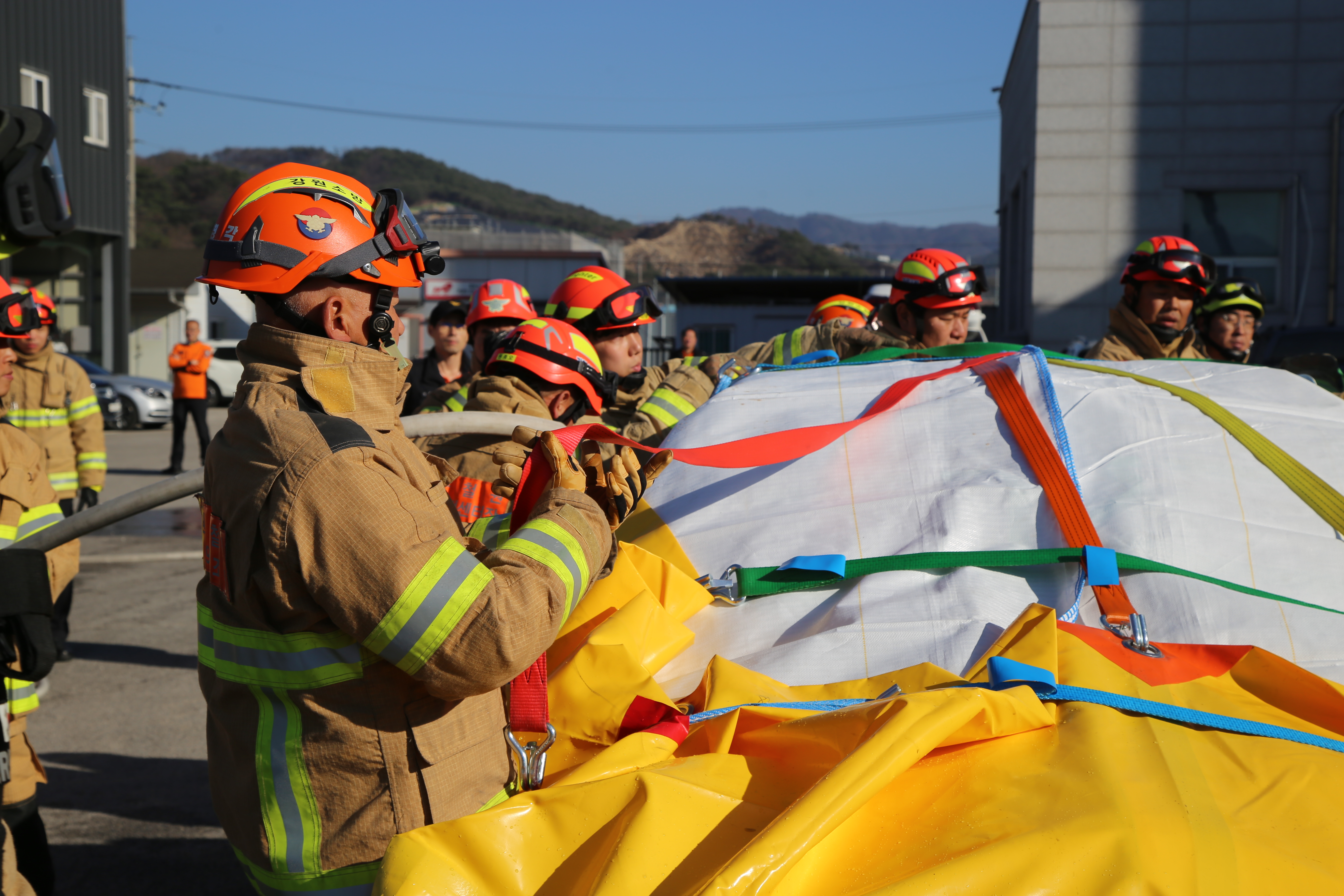 철원소방서 주차장에서 실시한 이번 훈련은 이동식 냉각 수조와 상방형 노즐을 이용하여 실시했다.