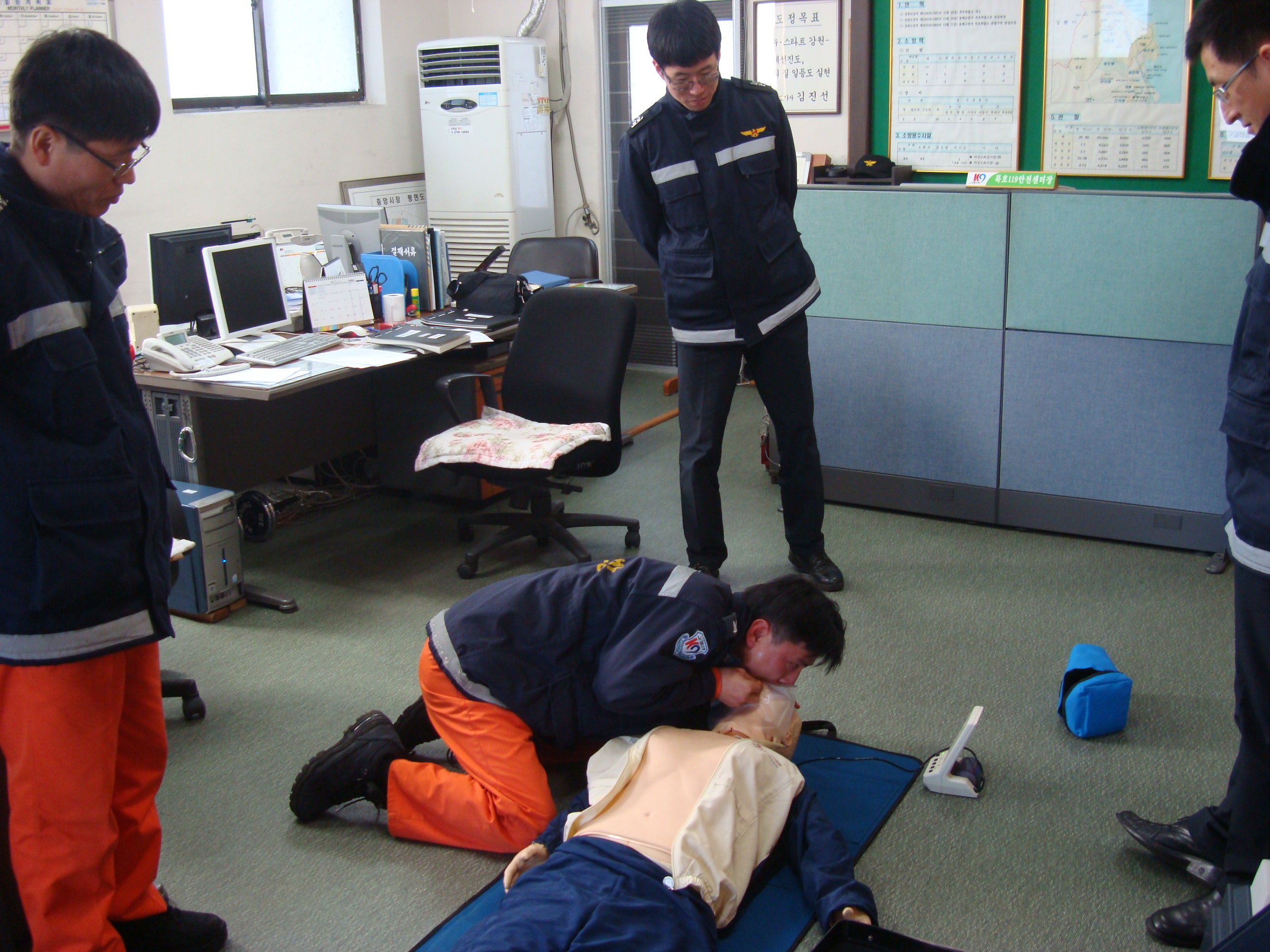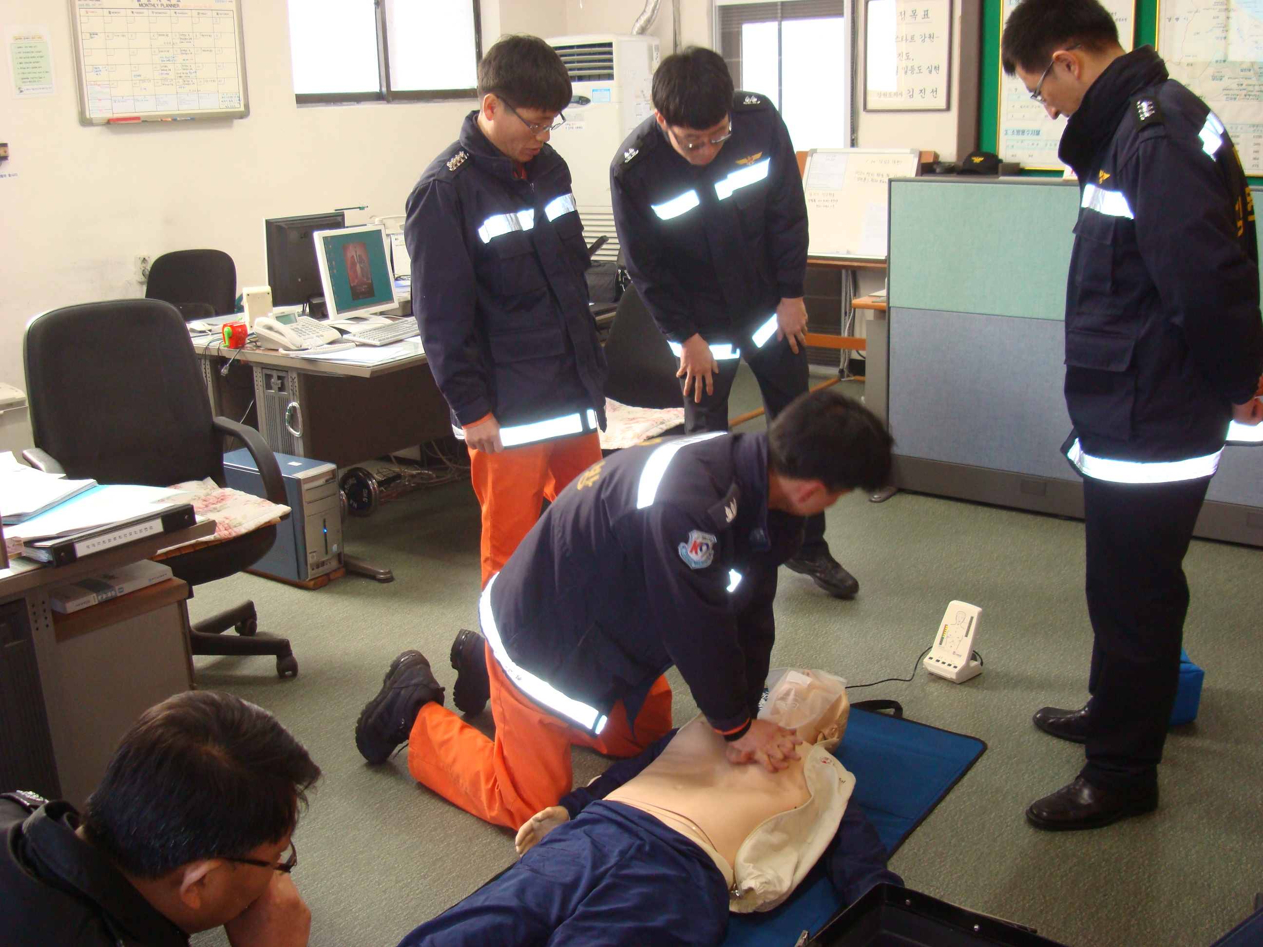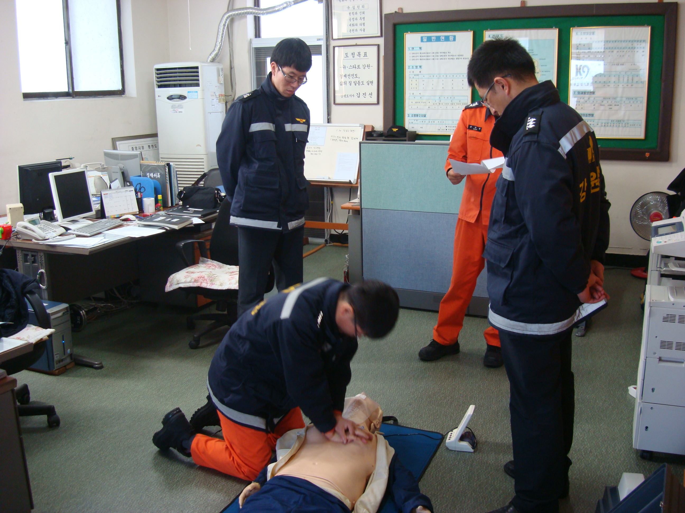 묵호119안전센터(소방위 이승원)는 1월29일 "능력있는 소방관, 신뢰받는 소방"으로 거듭나기위해 2010년 첫 발걸음을 내딛었습니다. 응급처치 능력을 배양하여 긴급구조기관 구성원으로서의 역할을 강화하고 직무 내.외 할동 중 사고현장에서 인명 소생율을 향상시키고자 CPR교육을 실시하였습니다.
