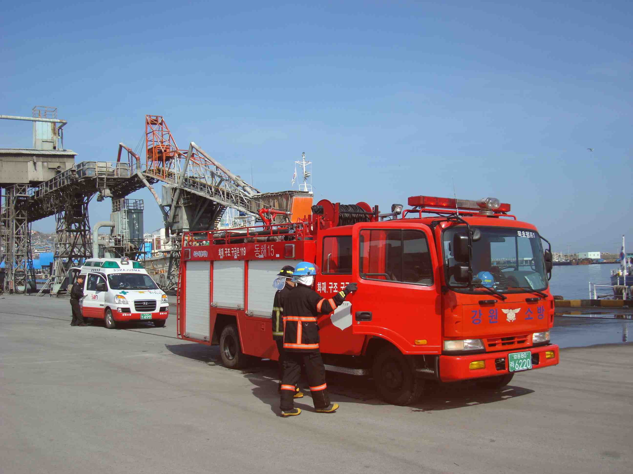 이날 훈련은 테러에 의한 정박 화물선 방화 및 폭파에 따른 화재진압 훈련을 실시하였습니다.
