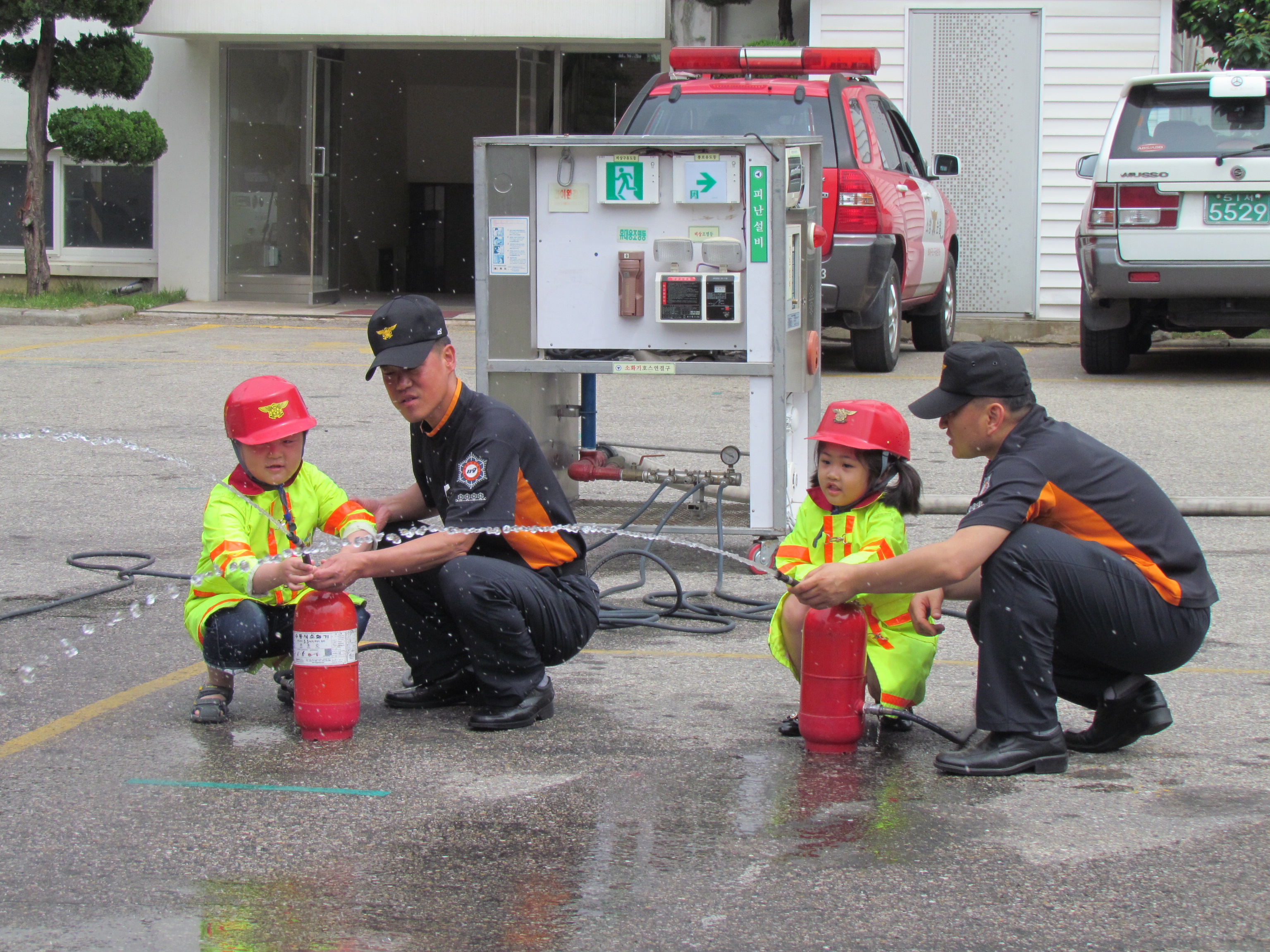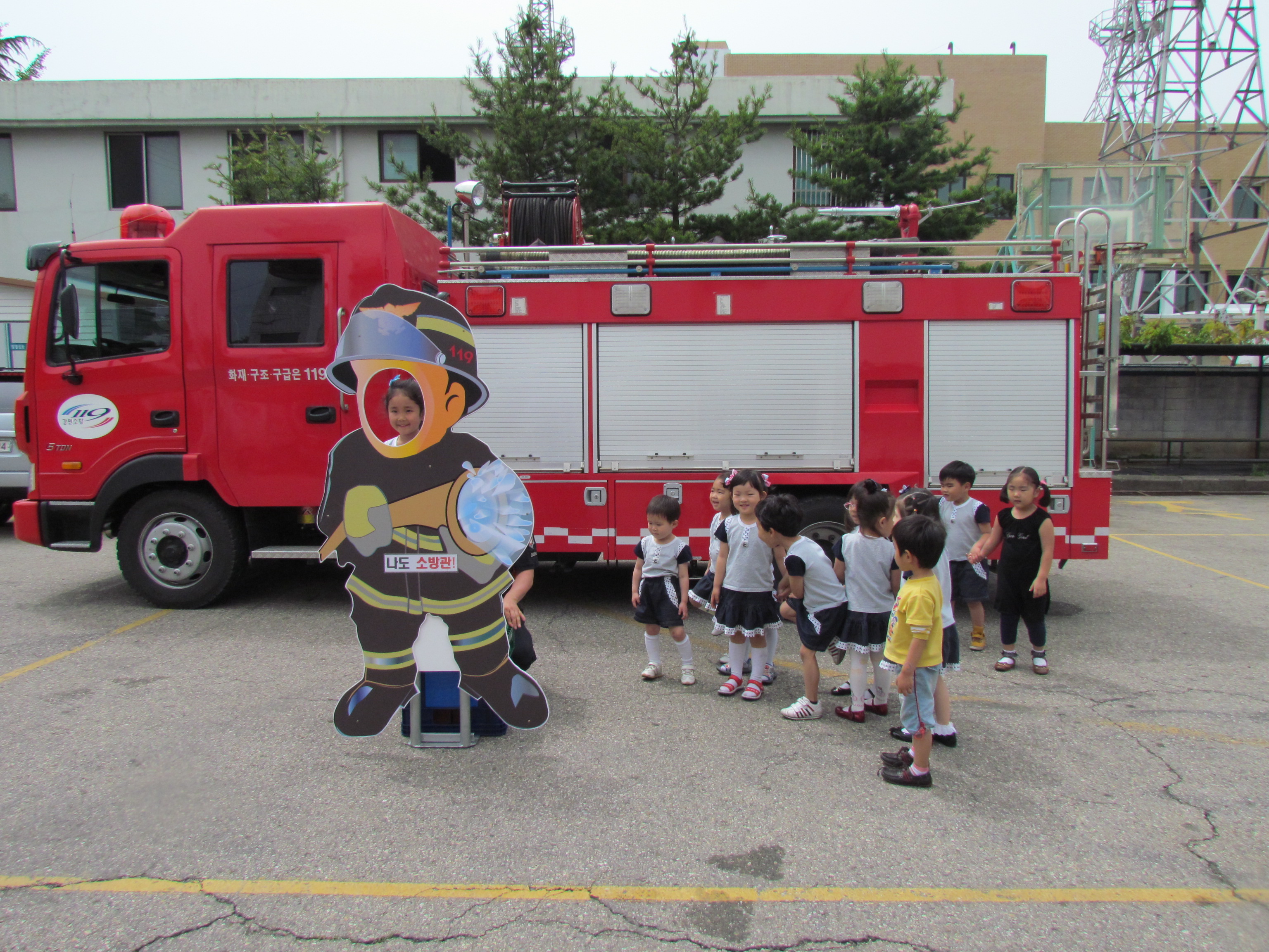 물소화기 체험장에서 소화기 사용법도 배우고, 119신고전화체험도 하였습니다~ 소방관 복장의 포토존에서 일일 소방관이 되어보는 유익한 시간을 가졌습니다