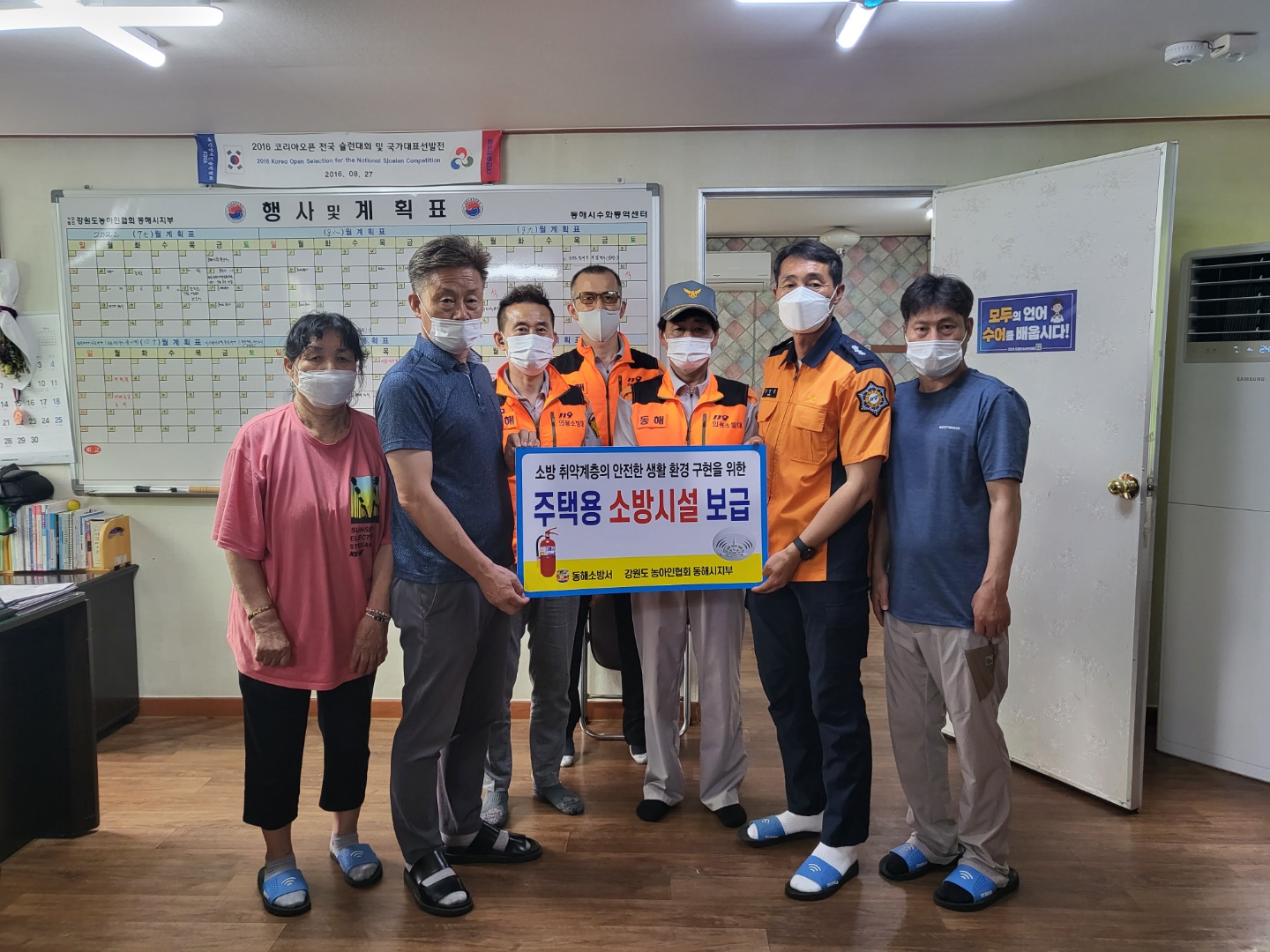 동해소방서(서장 이용길)는 21일 오후1시 총20명(소방7, 의용소방대13)이 참여 관내 청각장애인 45가구에 대하여 주택용 소방시설인 소화기 45개, 청각장애인용 감지기 90개를 보급했다.