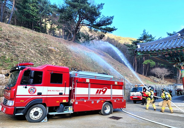 훈련 상황은 삼화사 경내 적광전에서 원인미상의 화재가 발생, 강풍으로 인해 산불로 확대되는 상황을 가상으로 설정해 훈련을 진행했다.