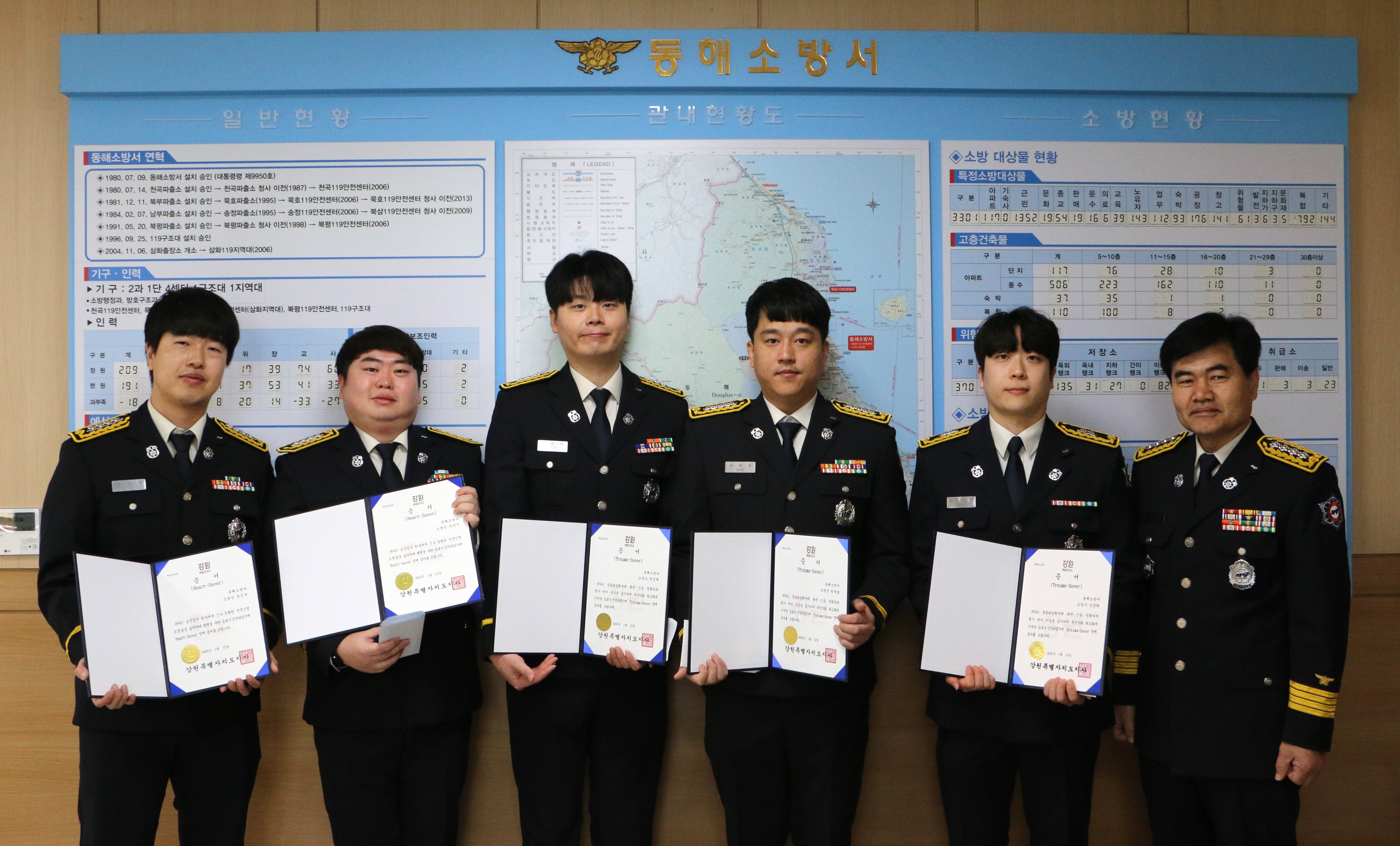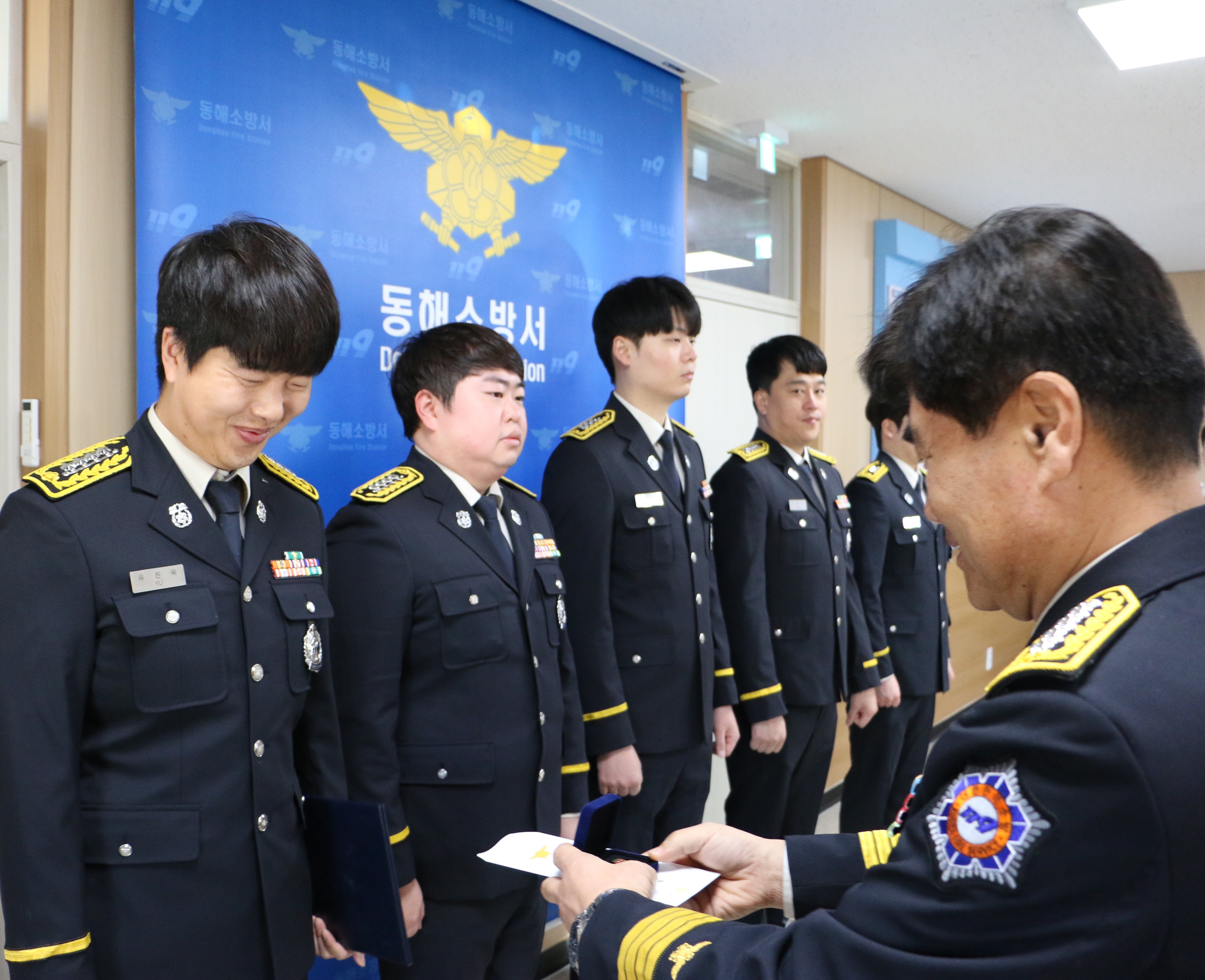 이날 수여식에는 수상자 중 5명이 참석하여 동해소방서장으로부터 증서와 배지를 받았다.