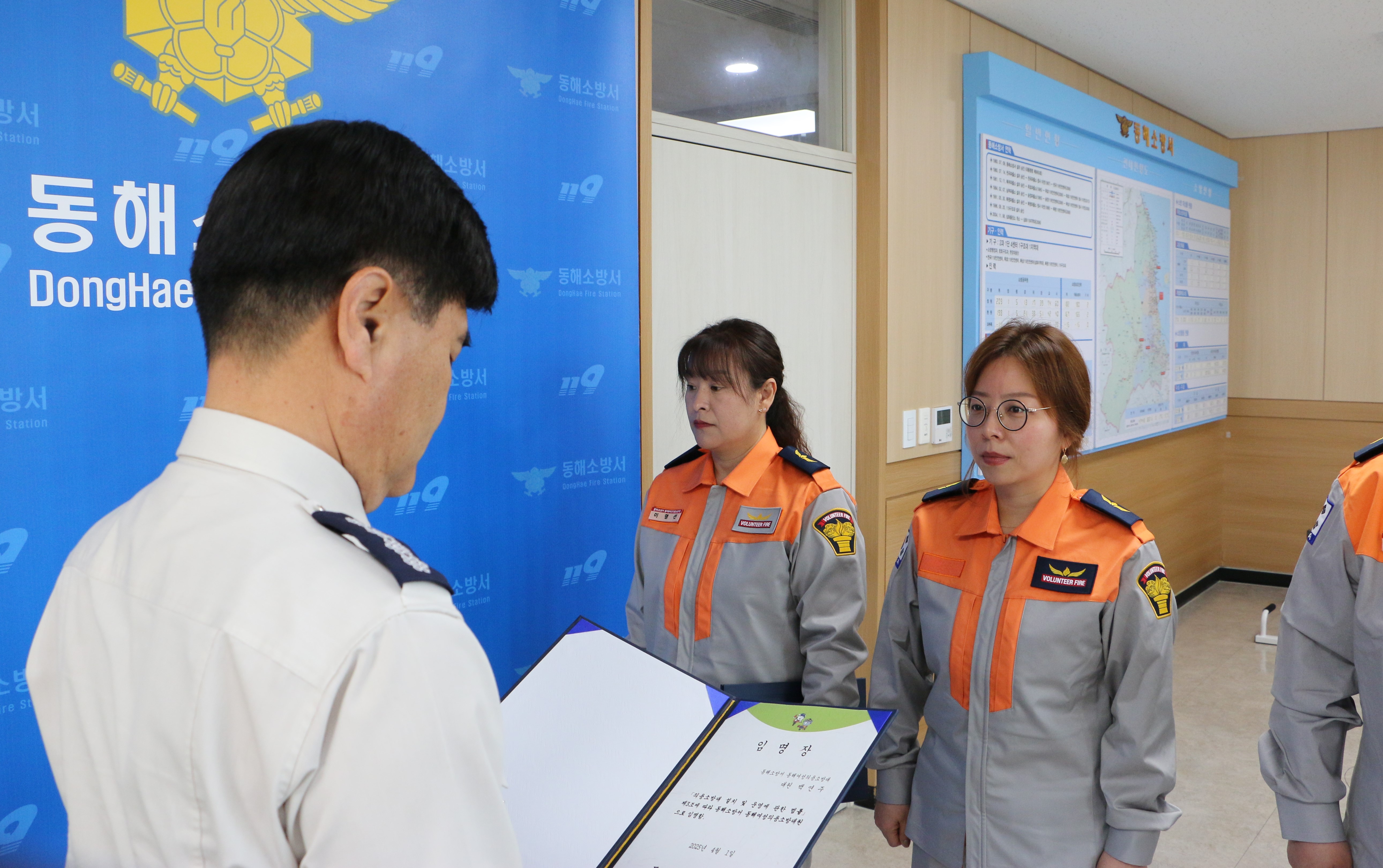 이 날 임명장 수여식은 심규삼 서장과 동해소방서 북평의용소방대장, 각 과장 등이 참석한 가운데 신규 의용소방대원 3명에게 임명장을 수여하고 기념촬영 순으로 진행됐다. 이번에 새로 임명된 이영선, 백연주, 김성매 대원은 의용소방대원으로서 주민들에게 봉사할 기회를 갖게되어 기쁘다며 앞으로의 활동을 기대하라는 포부를 밝혔다.