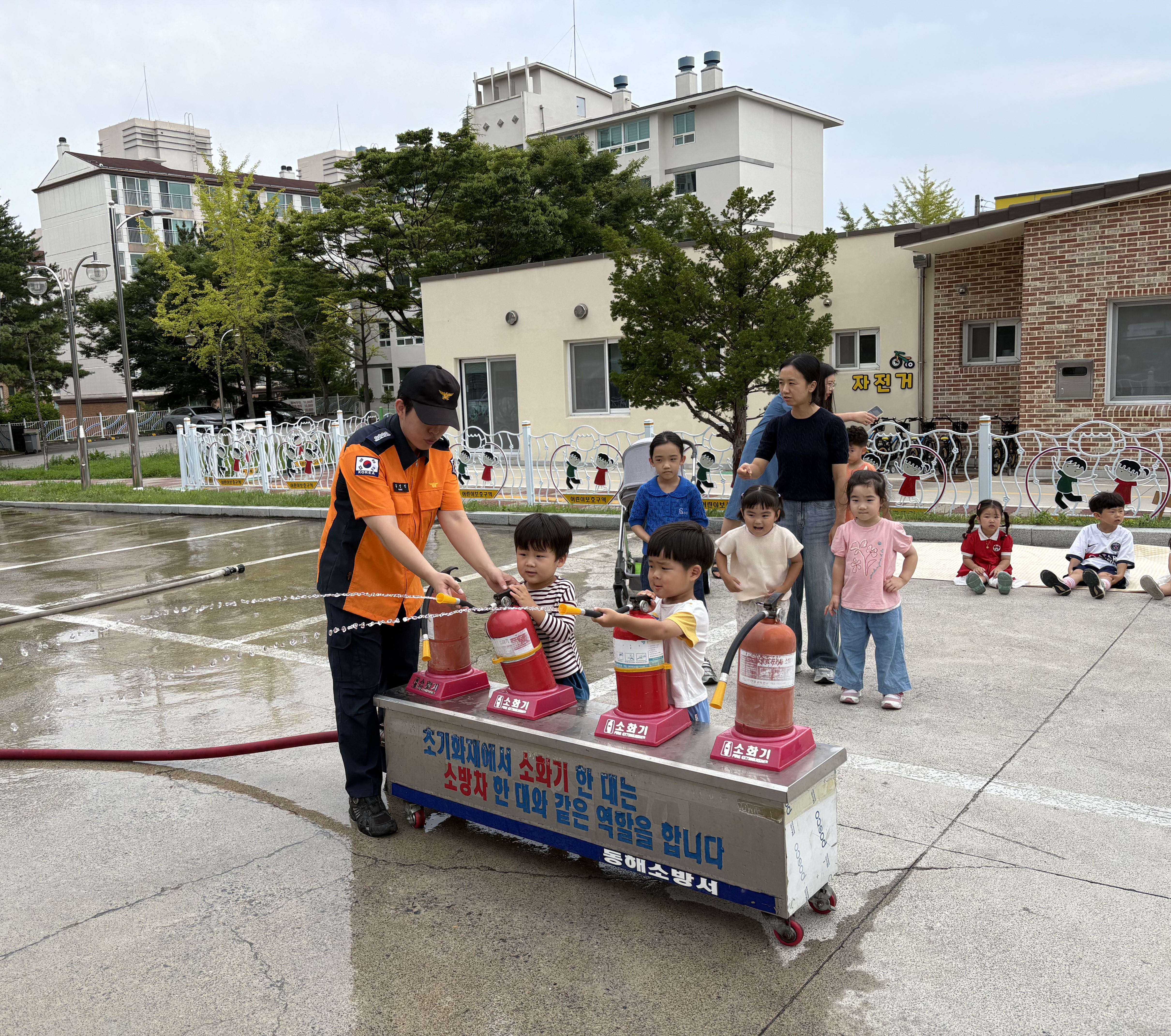 교육 내용은 ▲지진체험 ▲비상탈출체험 ▲소화기 사용법 ▲소방차량 탑승 체험 등으로 구성돼, 원아와 학부모 약 100여 명이 안전 행동요령을 직접 익히는 시간을 가졌다.