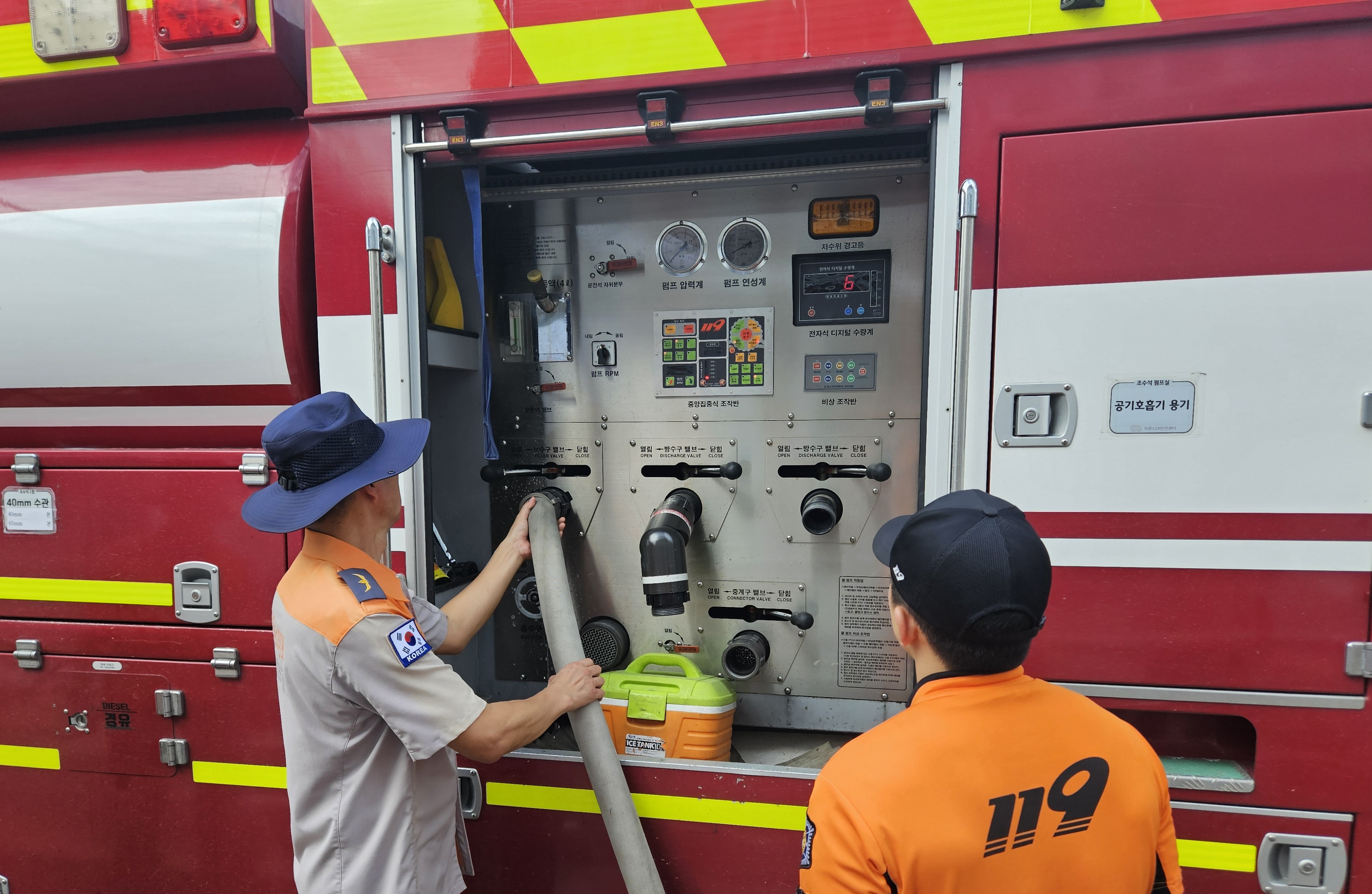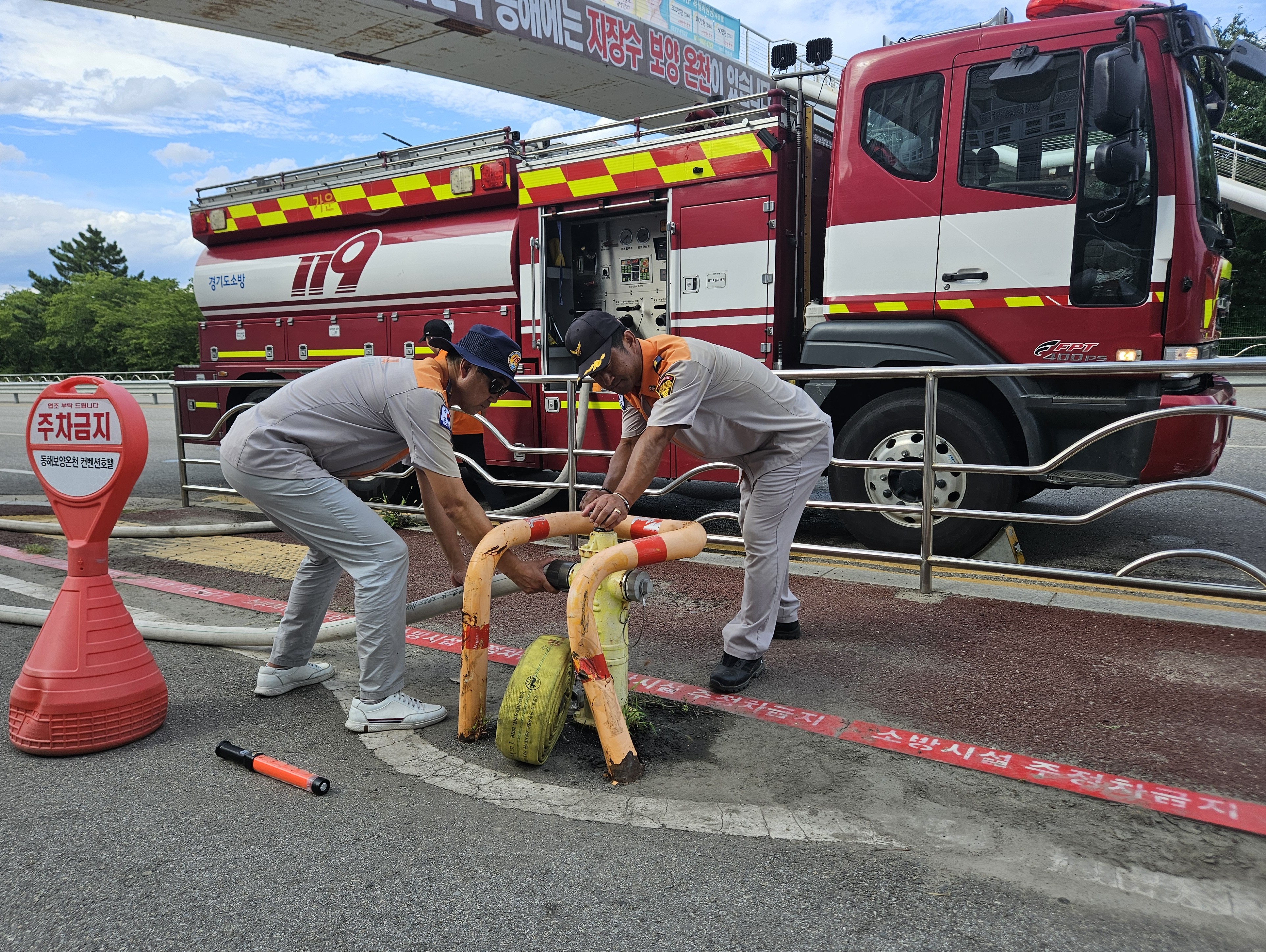 대원들은 취수 소화전 주변 안전 관리와 교통 정리, 취수 차량의 진출입 안내 등 원활한 급수지원을 위한 역할을 담당하는 동시에 취수 여건 변화에 따른 상황 정보를 공유해 현장 대응력을 높이고 있다.
