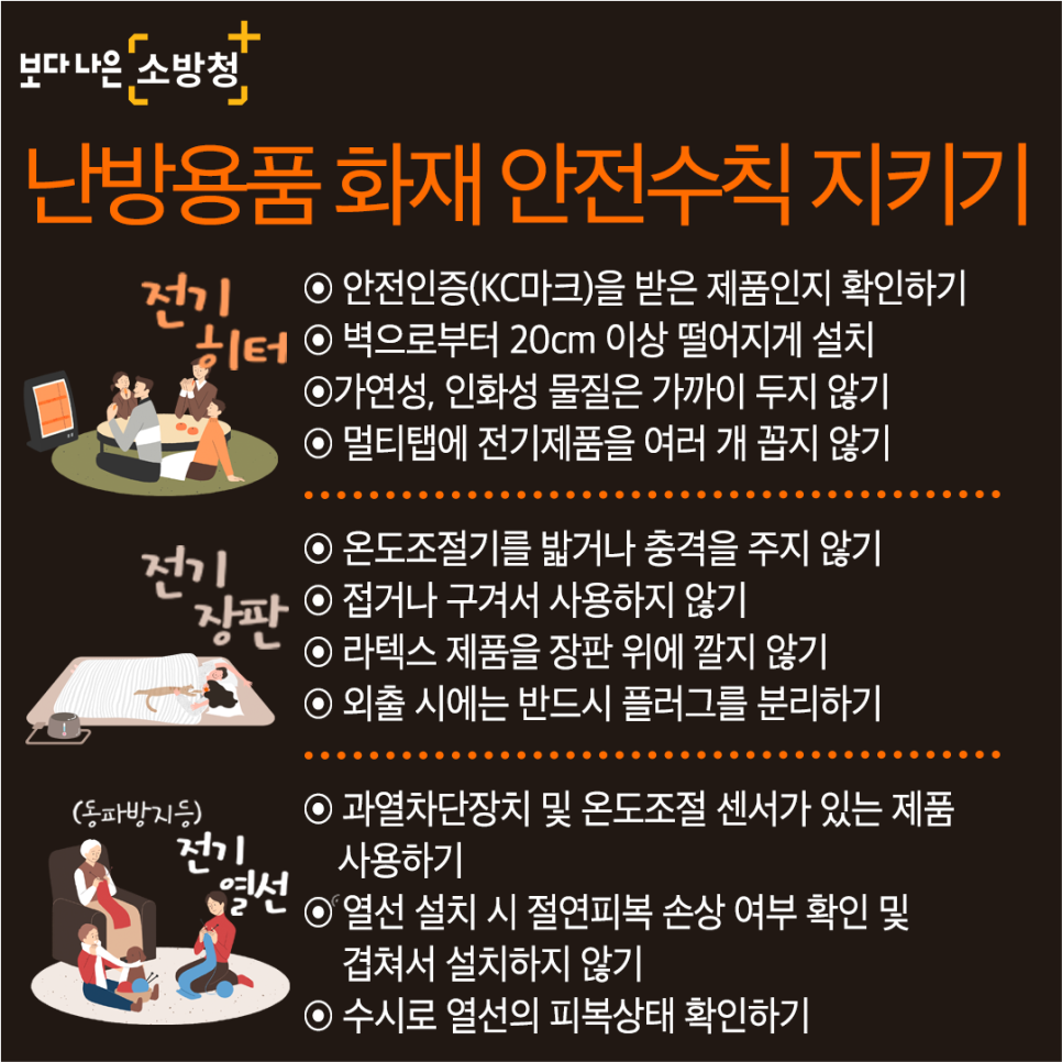 온열제품이 신체에 발 닿지 않도록 주의! 온열제품은 반드시 시간을 정해두고 사용! 당뇨환자나 수면제를 복용한 경우 더욱 주의!