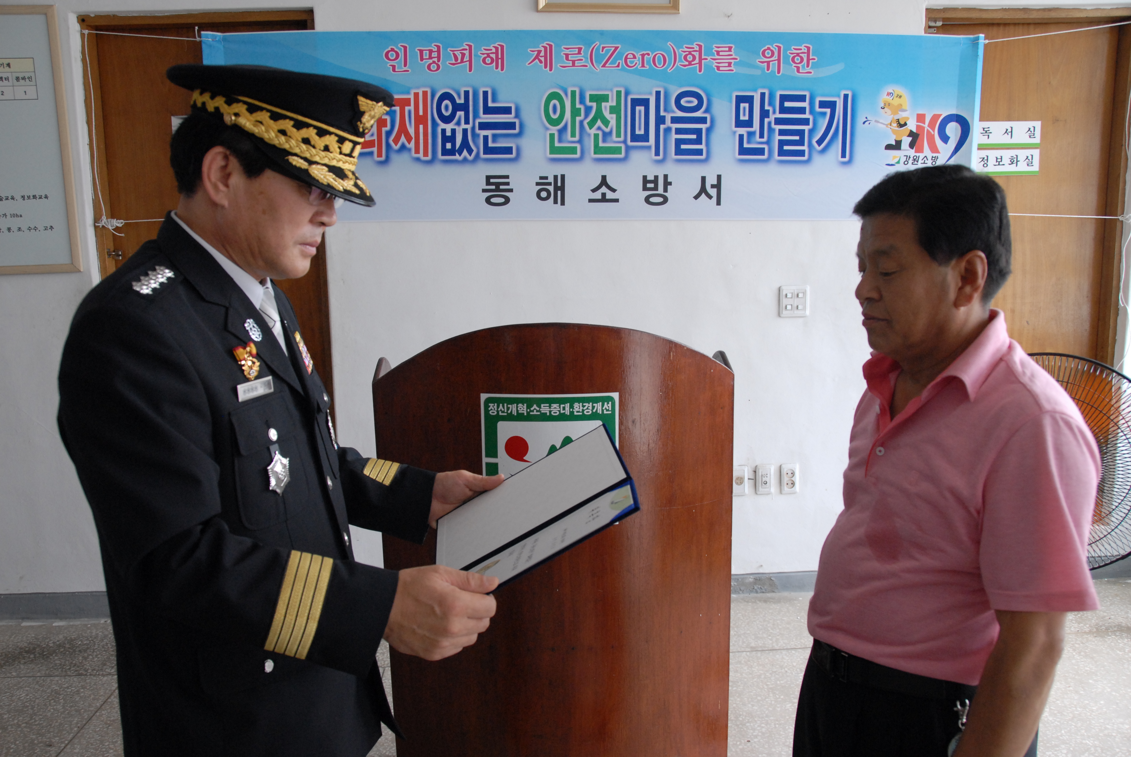 동해소방서(서장 김남숙)는 15일 오전 10시 동해시 북평동 23통, ‘단실마을’을 화재없는 안전마을로 지정하여 소화기 및 단독경보형감지기를 기증하는 행사를 가졌다.