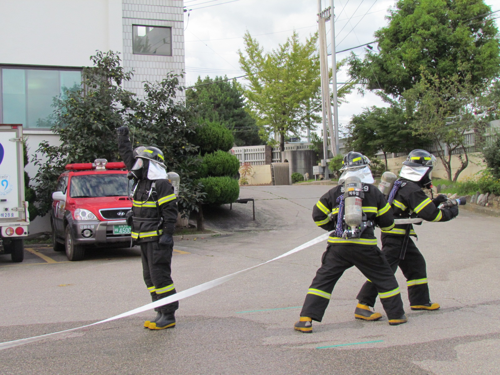 동해소방서(서장 김기성)는 20일 16시경 본서 후정에서 '강원도 소방전술경연대회' 출전 선수들의 화재진압 4인조법을 직원들에게 선보였습니다.