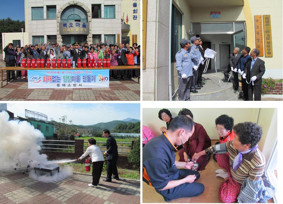 이날 행사는 소화기 50대 기증, 마을회관 내 현판부착, 명예소방관 위촉(통장 권원혁), 소화기 사용법 교육 및 응급처치교육, 주택안전점검 등을 병행했으며 동해소방서는 앞으로도 주택화재로 인한 피해를 최소화하고자 화재없는 안전마을을 지속적으로 확대 추진해 나갈 계획입니다.