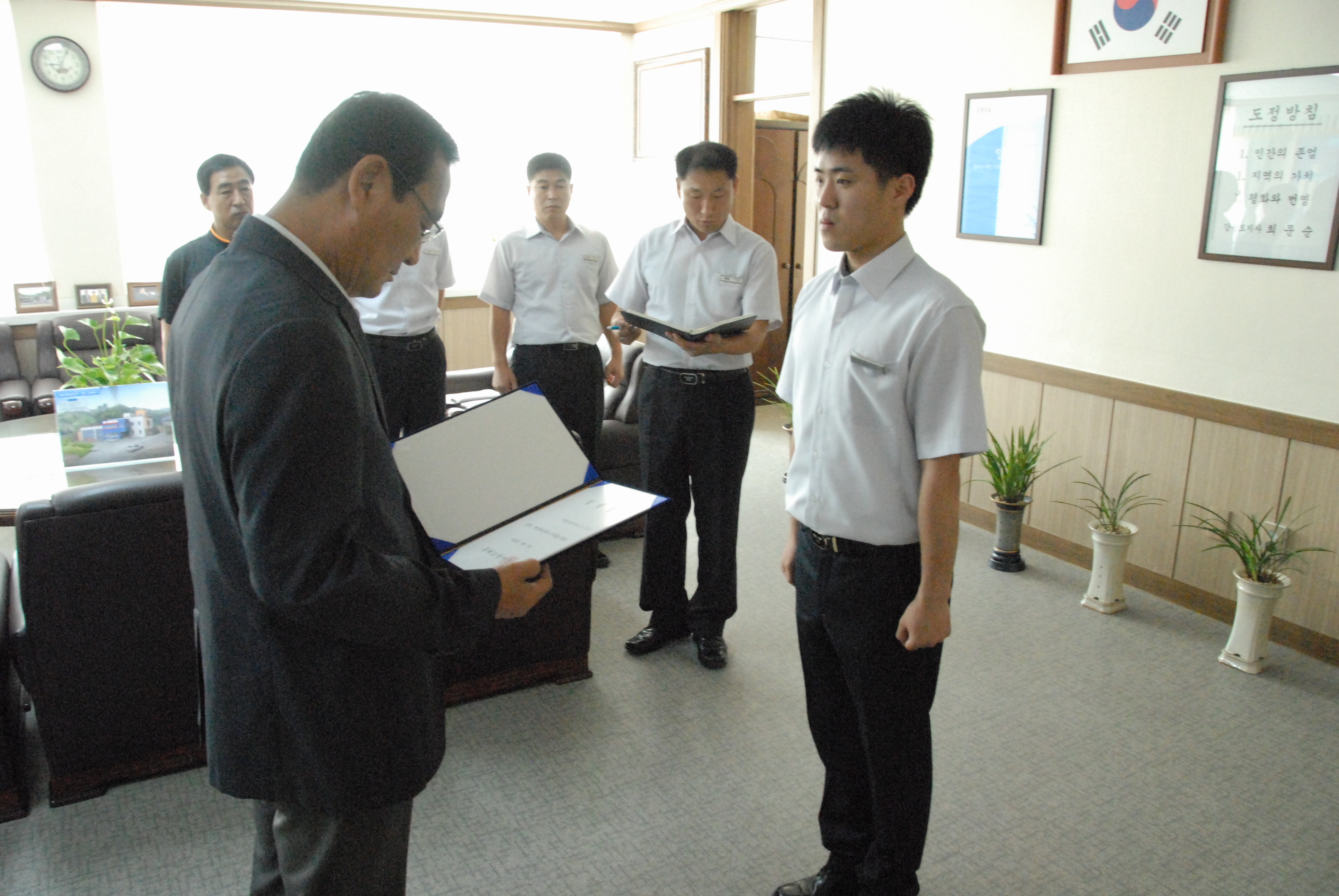 오늘(12.08.13) 동해소방서(서장 김기성)에서는 2년간의 군복무를 마치고 소방업무에 복귀한 직원(소방사 김무종)에 대한 신고식을 가졌습니다.