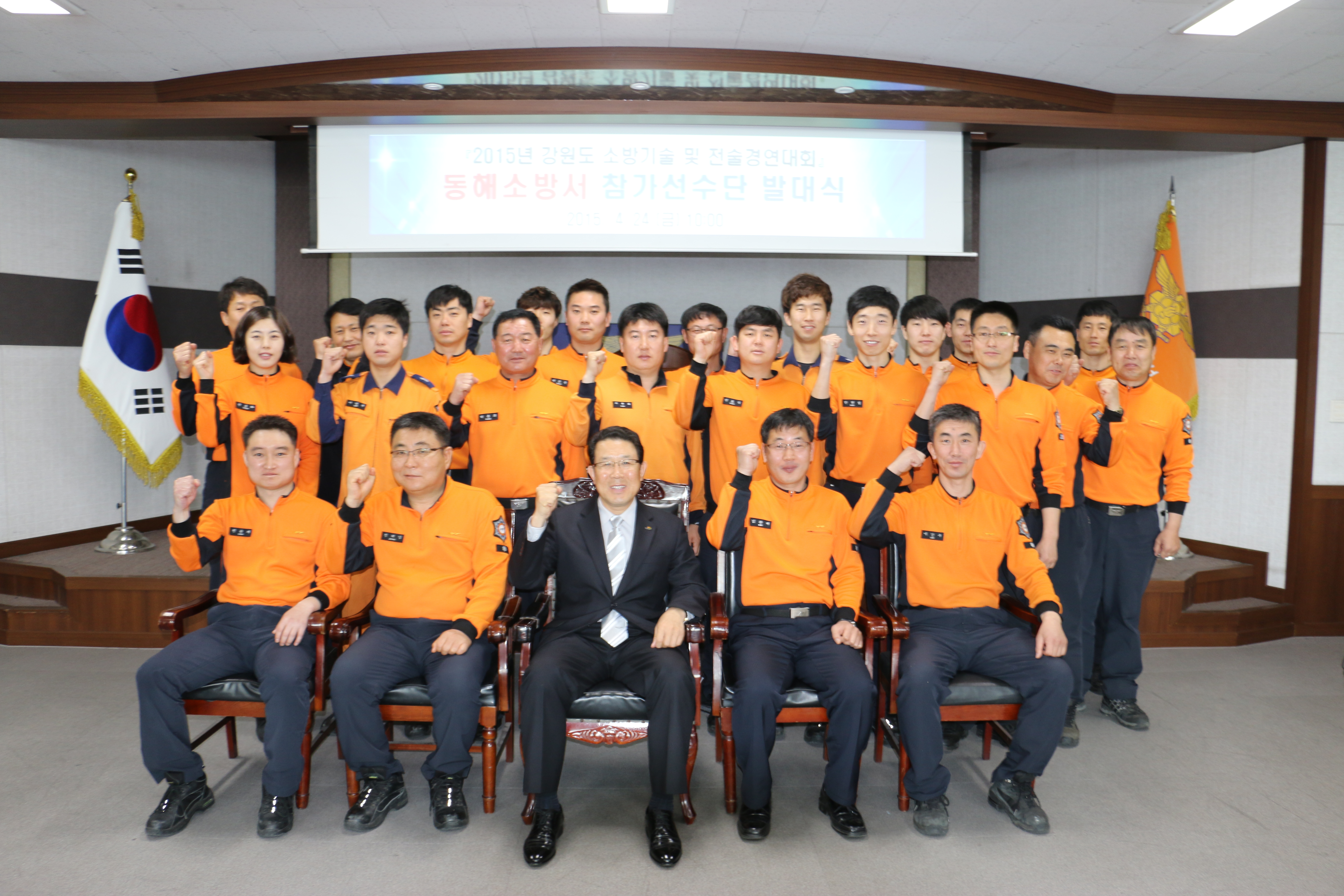 동해소방서(서장 주항중)는 지난 24일(금) 10시 대회의실에서 화재진압, 구조, 구급, 전술 등 4개 분야 선수 30여명이 참석한 가운데 2015년 강원도 소방기술 및 전술경연대회 참가선수단 발대식을 개최했다.