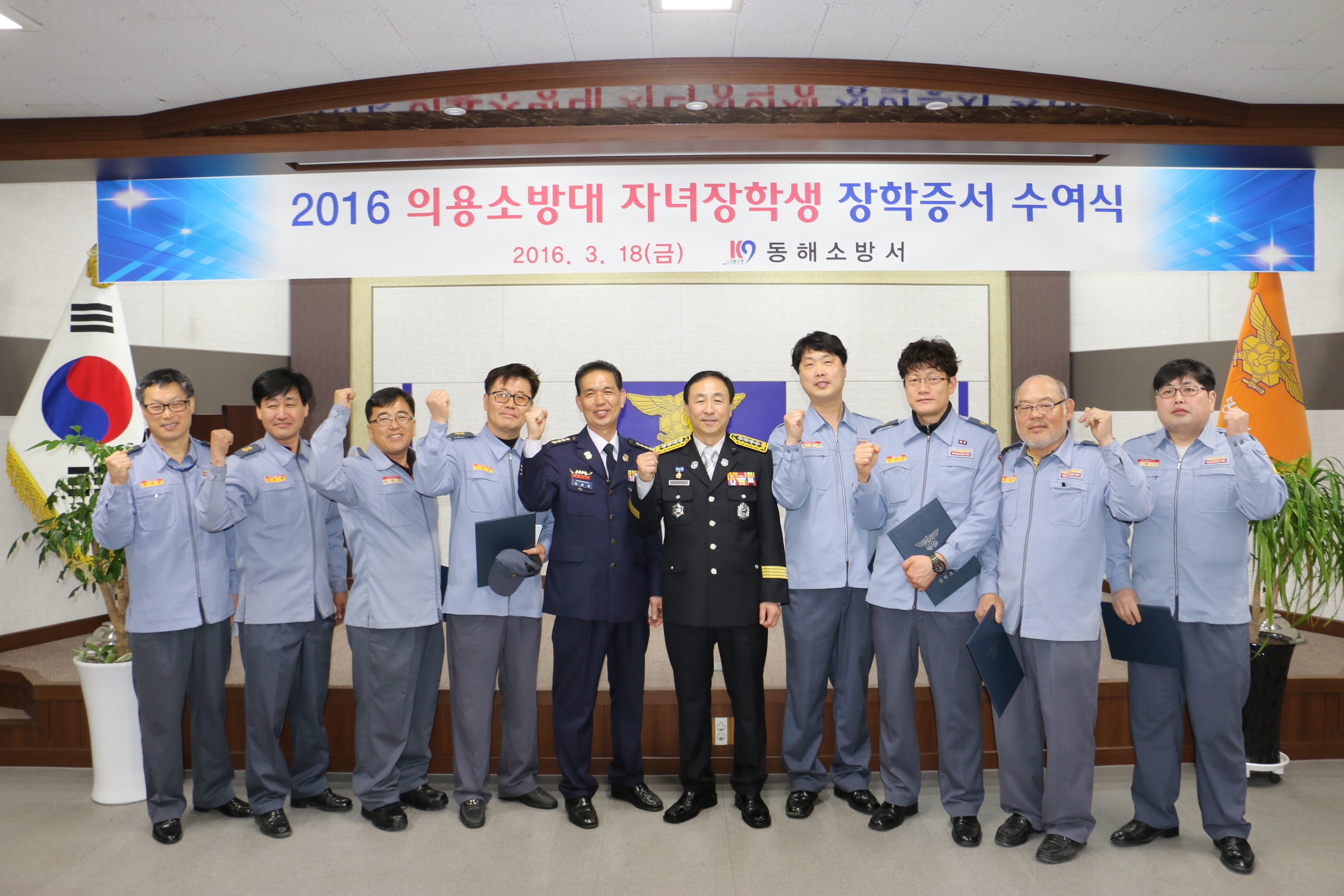 동해소방서(서장 김영조)는 18일(금) 오전10시 소방서 대회의실에서 의용소방대원 자녀들 중 학업성적이 우수하고 품행이 단정한 고등학생 7명, 대학생 4명 등 총 11명을 선발해 장학금 8백7십여만원을 지급하고 학부모에게 장학증서를 수여하고 대화의 시간을 가졌다.