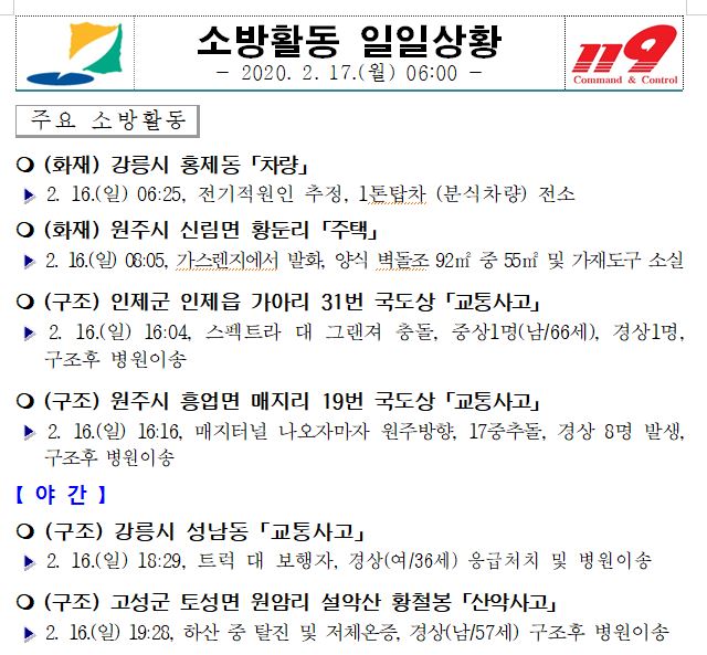 소방활동 일일상황 (2. 17. 월) 06:00