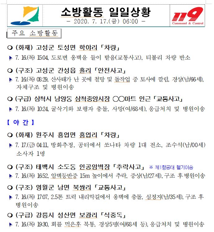 소방활동 일일상황 (7. 17. 금) 06:00
