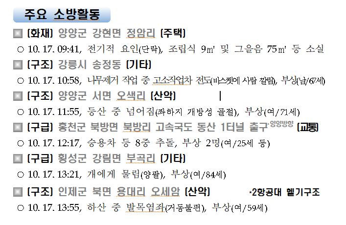 강원도 소방활동 주간상황(10. 17. 토) 17:00