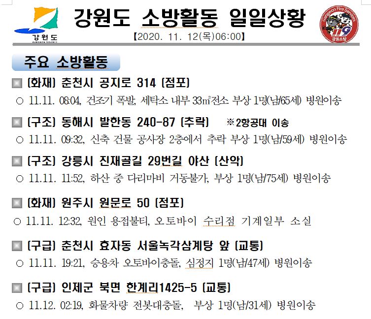 강원도 소방활동 일일상황(11. 12. 목) 06:00