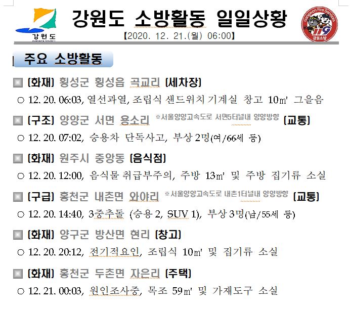 강원도 소방활동 일일상황(12. 21.월) 06:00