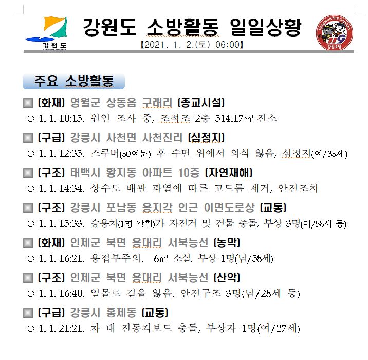 강원도 소방활동 일일상황(1. 2. 토) 06:00