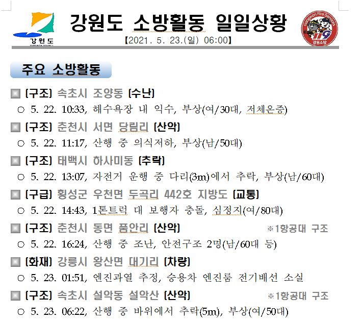 강원도 소방활동 일일상황(5. 23. 일) 06:00