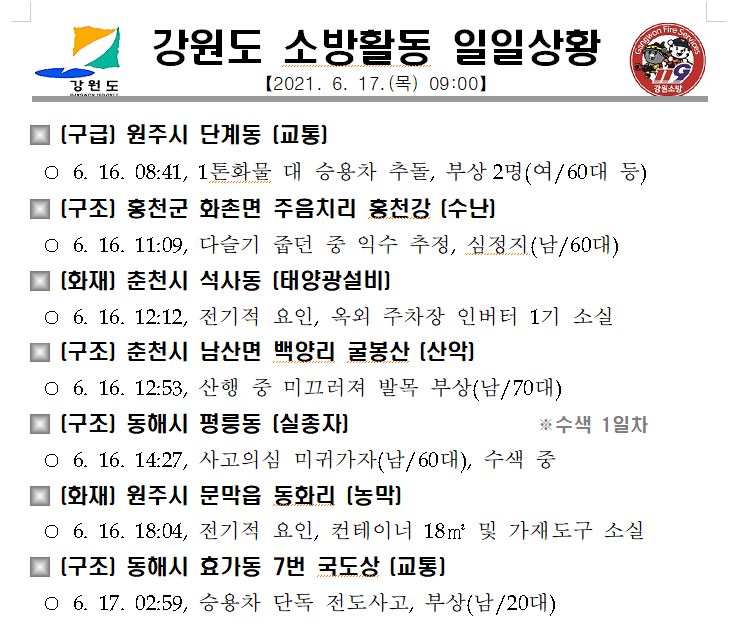 강원도 소방활동 일일상황 (6. 17. 목) 06:00