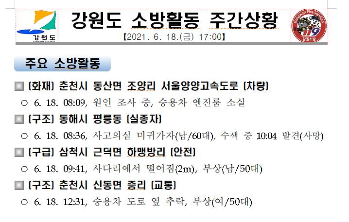 강원도 소방활동 주간상황 (6. 18. 금) 17:00