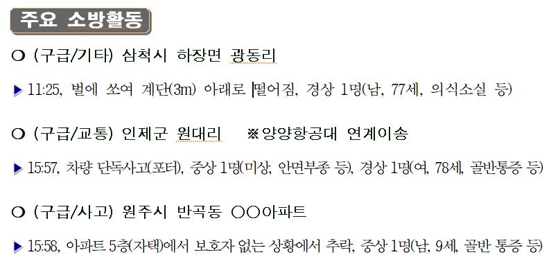 119 소방활동 상황보고(07. 05. 화) 17:00 및 인제군 원대리 차량단독사고 사진