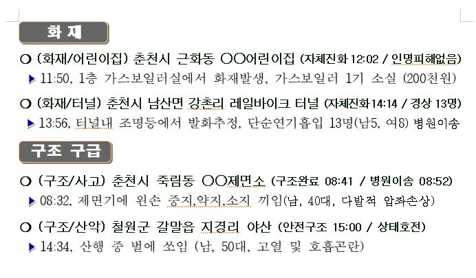 4. 조치 : 소방 6명 , 춘천성심병원 이송, 경찰 7명 춘천성심병원 이송