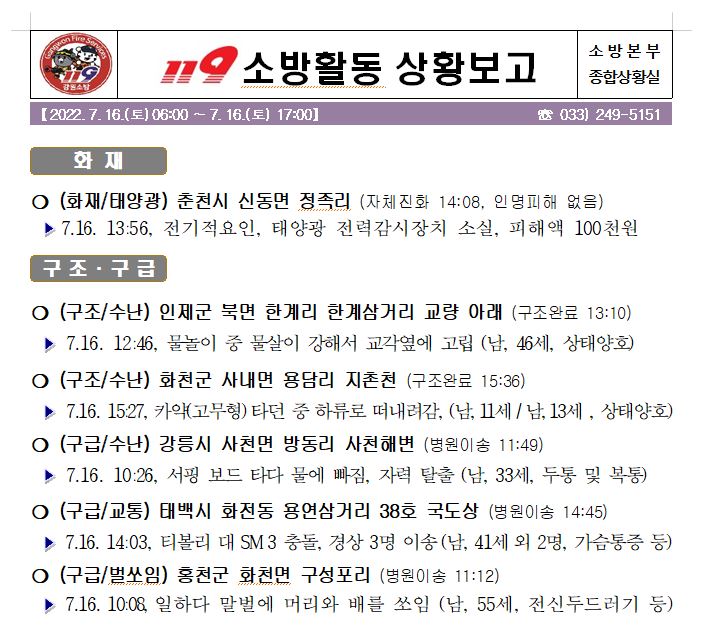 119 소방활동 상황보고(07. 16. 토) 17:00