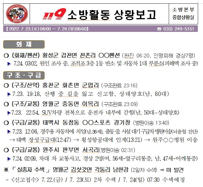 119 소방활동 상황보고(07. 24. 일) 06:00 및 횡성군 갑천면 펜션화재 사진