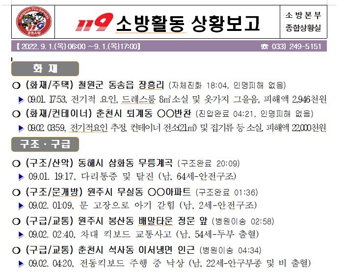 119 소방활동 상황보고(09. 02. 금) 06:00