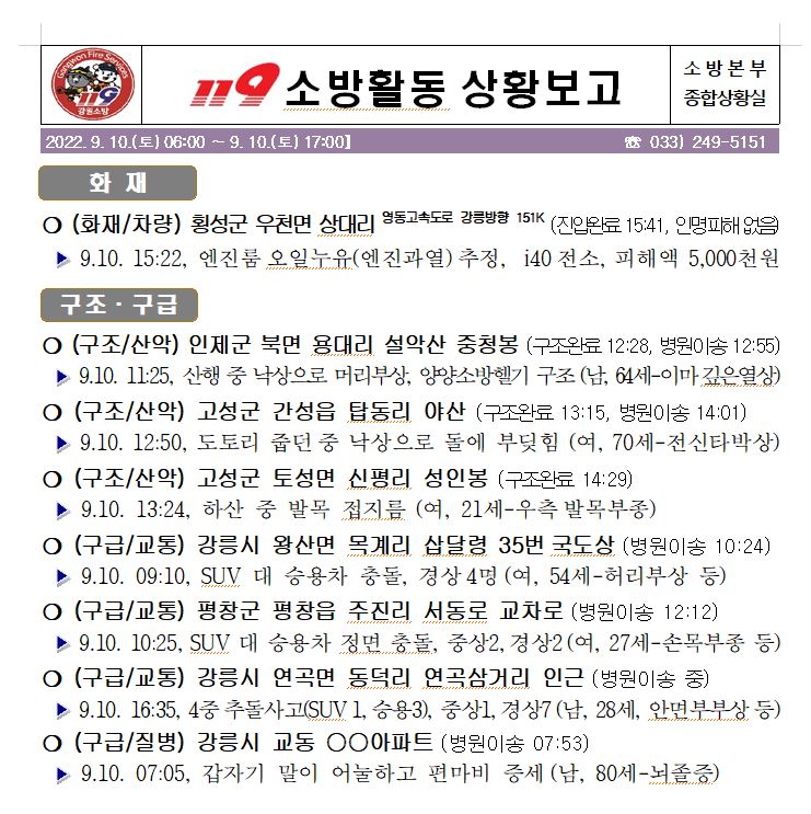 119 소방활동 상황보고(9. 10. 토) 06:00