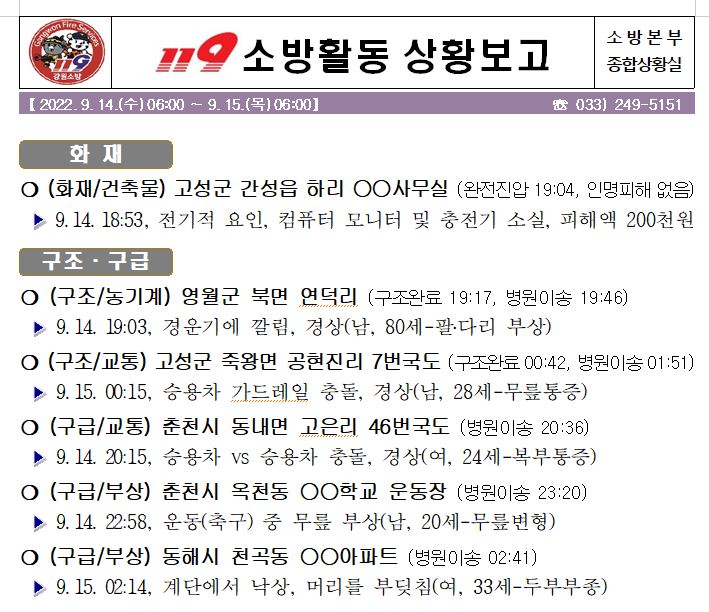 119 소방활동 상황보고(9. 15. 목) 06:00