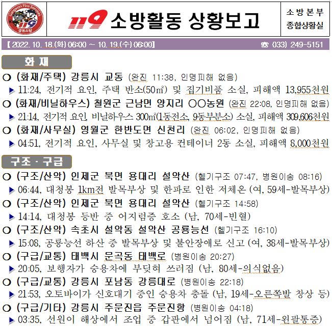119 소방활동 상황보고(10. 19. 수) 06:00