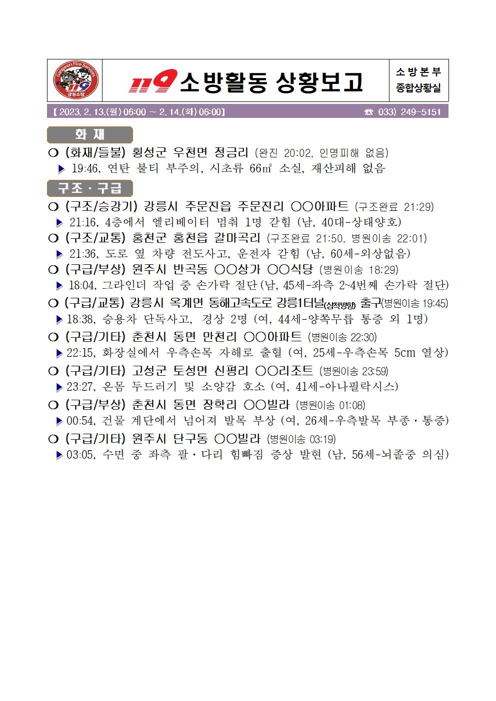 119 소방활동 상황보고(2. 13. 월) 17:00