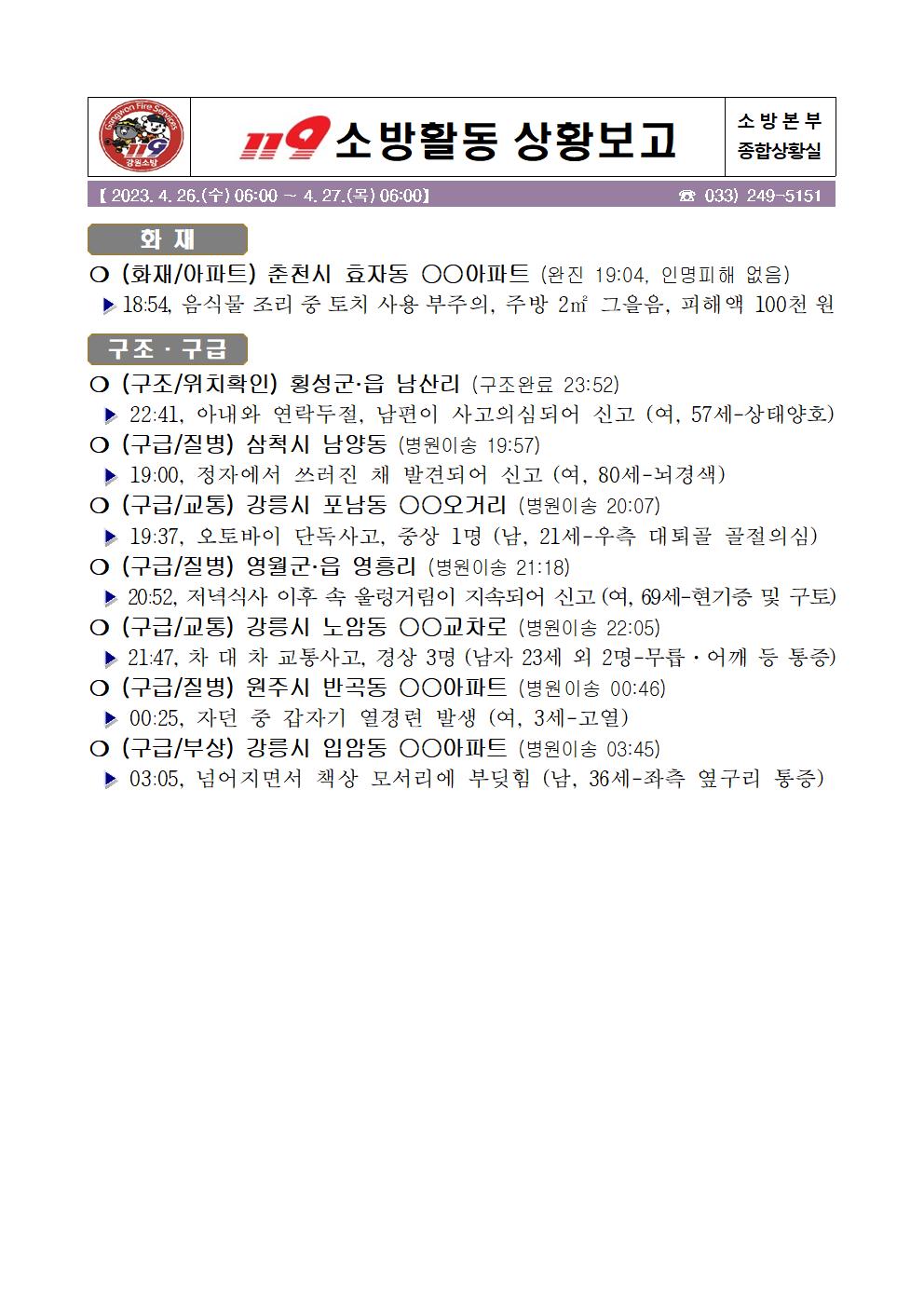 119 소방활동 상황보고(4. 27. 목) 06:00