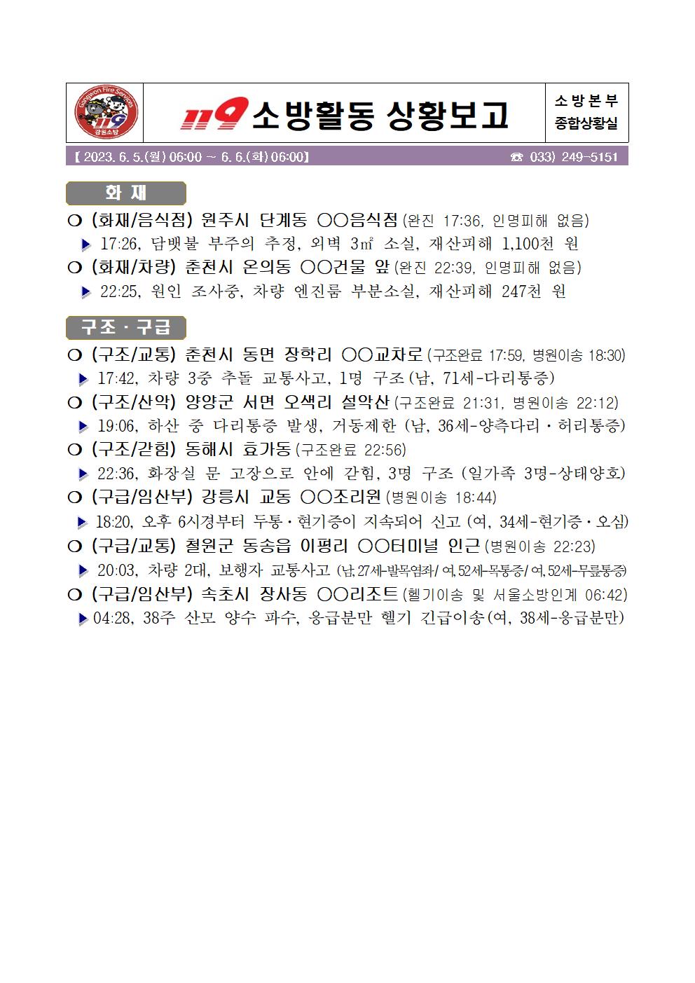 119 소방활동 일일상황보고(6.6.화) 06:00