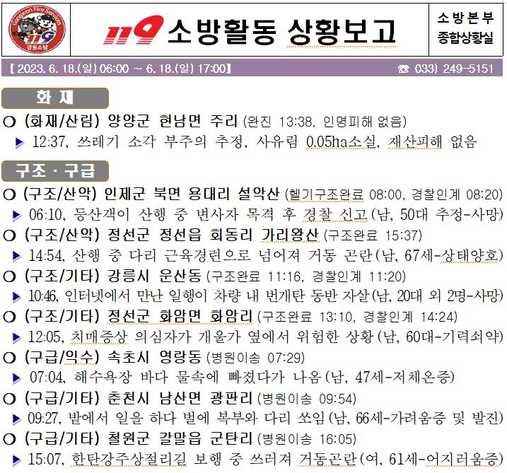 119 소방활동 일일상황보고(6.18.일) 17:00